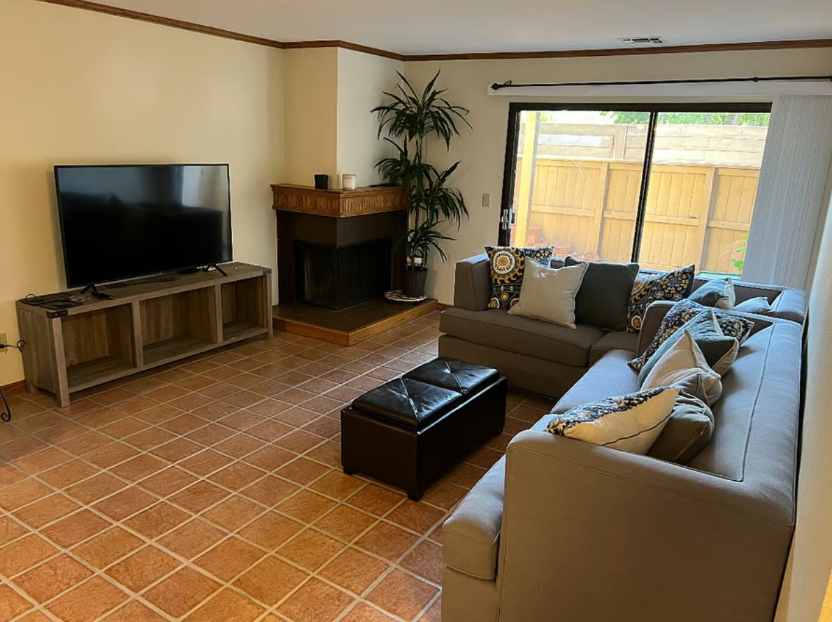 Cozy 2bd/2ba condo with tile floors throughout, stainless steel appliances, and living room with fireplace and slider to covered patio that has a small storage closet in patio.