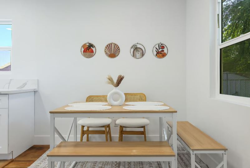 Cozy Boho 3bd/2ba home with layout allows for endless opportunities to host within your new community as the dining room boasts a table that can fit 6 with easy access to the kitchen. For extra space, utilize the couch which turns into a cot for two. An added bonus is the fact that the third bedroom can be utilized as an office space. The simple yet aesthetic bathrooms offer a place to refresh and reset in preparation for a long day or to unwind from one!