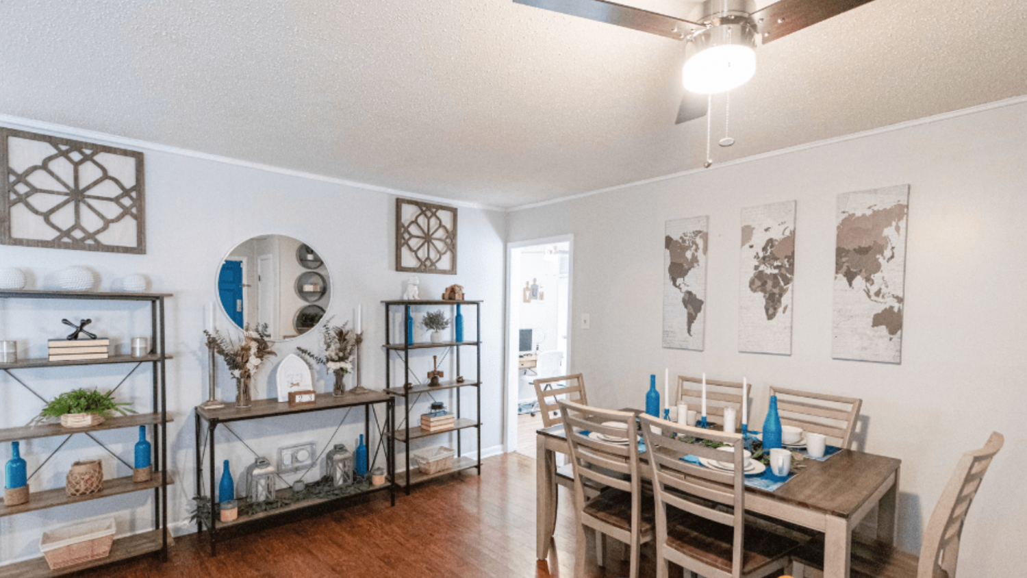 The dining table is ideally nestled by the kitchen, allowing you to easily set the table and enjoy tasty homemade meals.