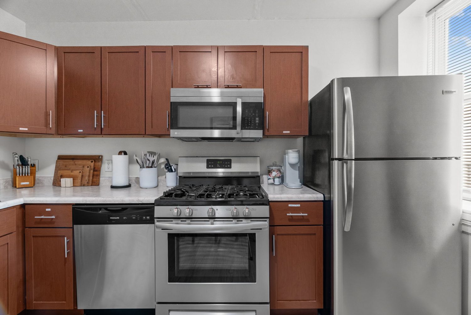 Fully stocked kitchen with stainless steel appliances, gas stove, cookware, dishes, and utensils.
