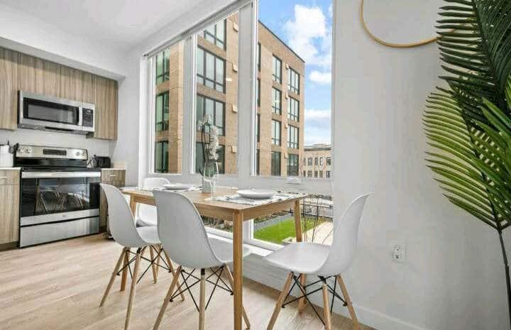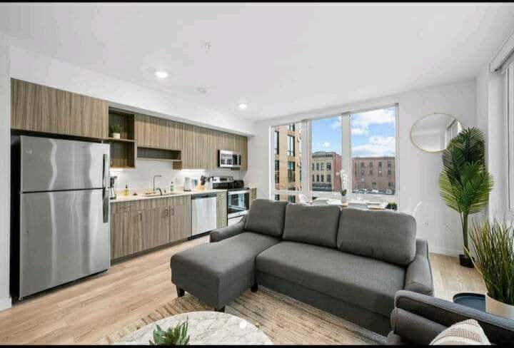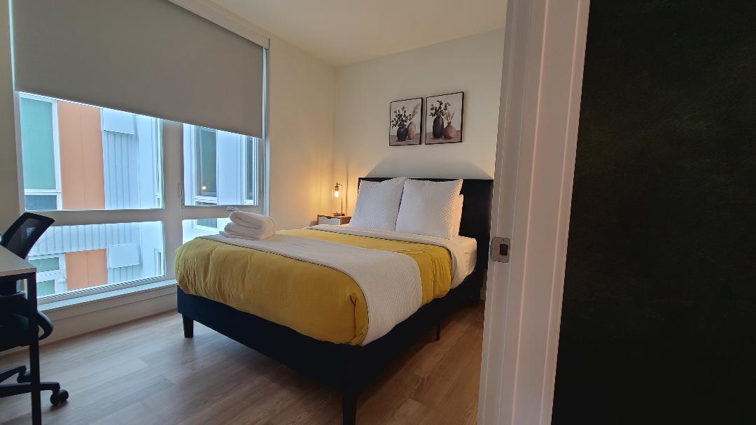 Modern 831 sq ft Apartment. Located in the heart of Downtown. Fully Furnished including Linens and Housewares, 2 Desks w/ Monitors. Building has an Elevator, Exercise Room, Rooftop Terrace, Fenced Dog Run and Bathing Station. 1 Assigned Covered Parking Space. Electric Vehicle Charger. 2 Queen Beds.