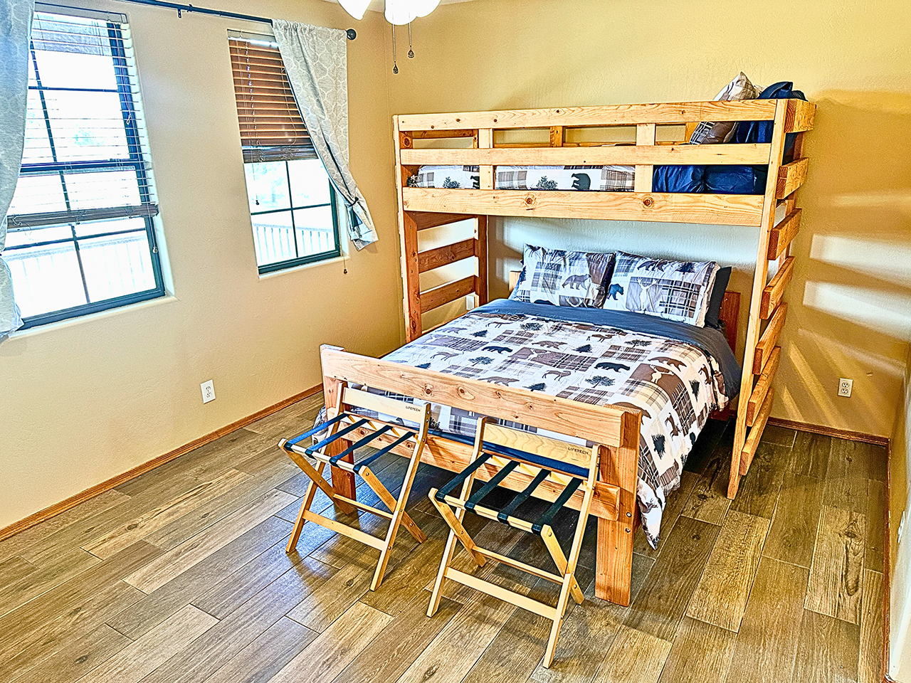 The 2-bedroom condo is decorated beautifully by local wood artist creating a beautiful log cabin feel, From the hand-made Novak dining table to the Mr. Bunkbed twin over queen bed that was made in our home. Bright, modern two-bedroom condo with everything you need for a comfortable Arizona getaway or work trip. Sleep soundly on the log-frame queen bed, cook meals in the stocked kitchen, and refresh in one of the clean, spa-like bathroom with a shower or soak in the second bathroom tub (fresh towels provided). Stay productive with fast Smartlink Wi-Fi, then unwind in the living area with a Smart TV. Step onto the large private balcony to sip morning coffee and end the day under Arizonaβs starry skies. π΅β¨