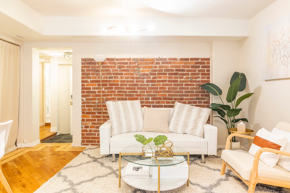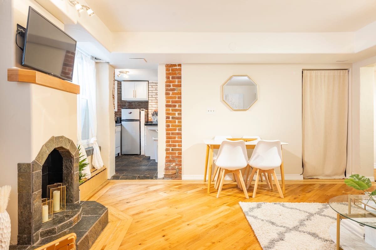 This garden-level luxury condo offers plenty of light and a clean, modern feel. The newly renovated bathroom features a walk-in shower with a fixed shower head and hand-held sprayer. The bedroom features a king bed with all white linens for an extra comfortable, clean experience. Color-changing hanging lamps create any ambience and the desk nook is perfect for working during your stay (Internet: 800mbps). Carefully planned for your convenience, come experience this one of a kind historic condo.