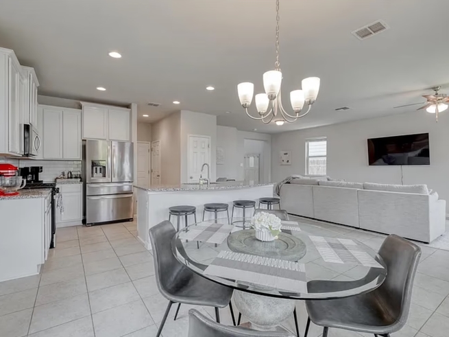 Beautiful fully furnished 4 bedroom 2.5 bath, open concept home. Built n 2020, this home is in new condition, quality furnishes throughout, Beautiful kitchen with Granite counter tops, stainless appliances, large island with seating for 4,.cabinets have lots of storage, nice pantry closet, Large Master bedroom with attached bathroom and walk in closet, 3 additional nice sized bedrooms and a second family room up stairs that can be used for a family/game room, office, play room or home theater, Inside laundry room with washer and dryer, 2 car garage and parking in the drive way, nice private fenced yard with patio furniture, well kept and quiet neighborhood, Menchacha is a fun area with lots of outside eateries with live music, walk to coffee, restaurants, shopping, ride bikes, great walking neighborhood. Landscaping, utilities, and HOA fees included with rent, Downtown Austin is just a quick 15 minute drive using Menchanca Rd and not need to get on a Highway unless desired. This home is turn key and ready for your stay,