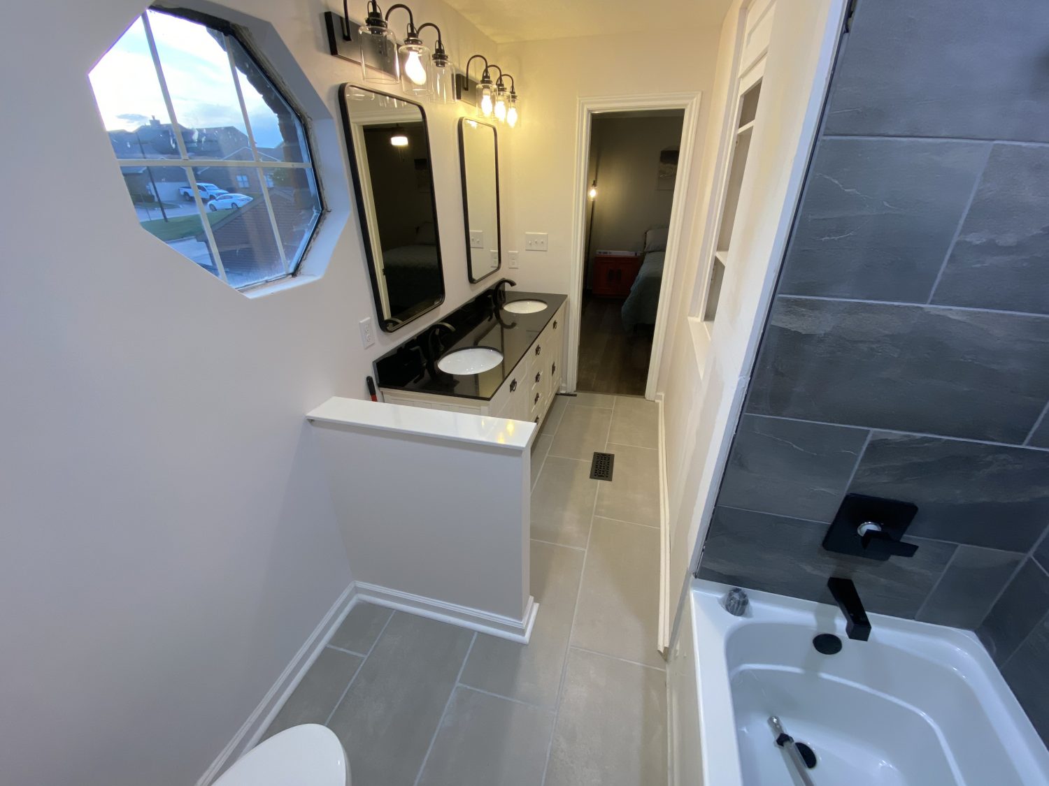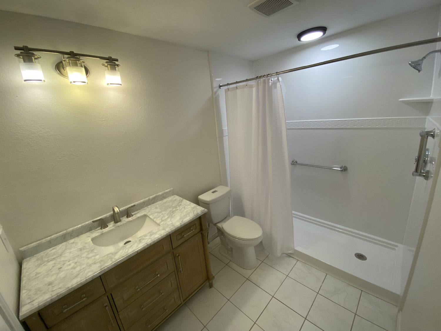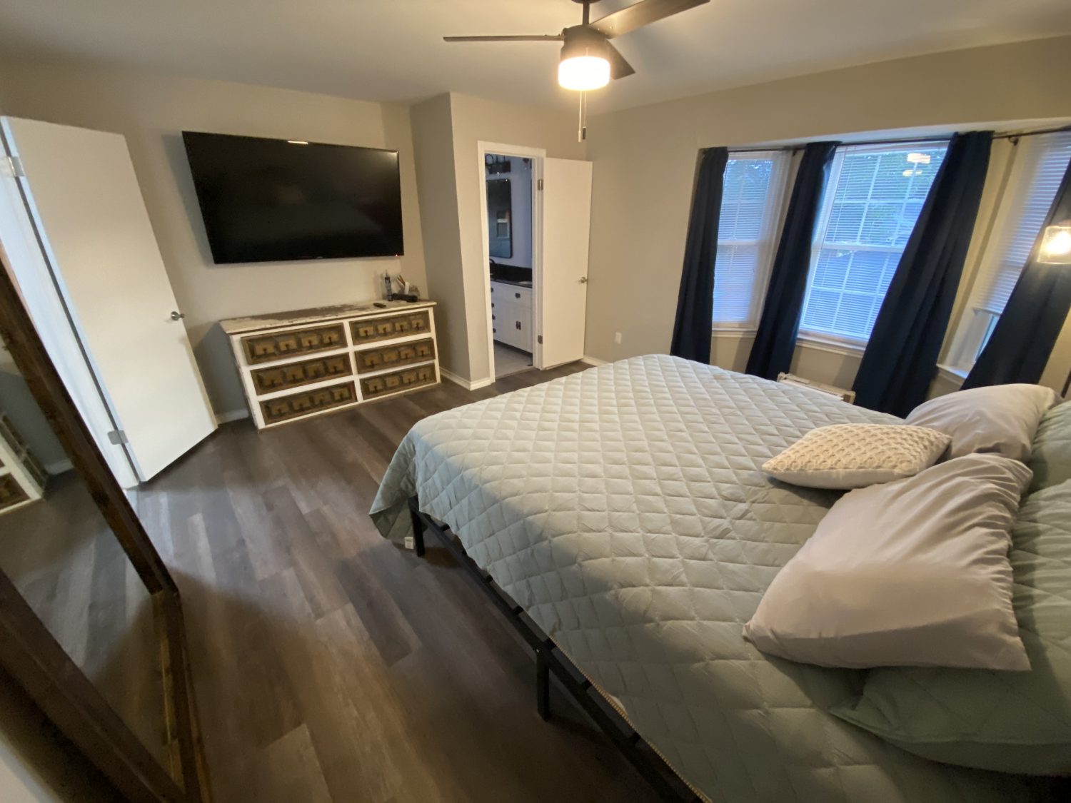 Upstairs has a remodeled full bathroom and laundry room. Bedroom 1 (primary) has a king size bed with a 65" TV and remodeled private double-sink bathroom. Bedroom 2 has a full size beds with 50" TV (that can be upgraded to Queen or King upon request). Bedroom 3 has a king size bed 50" TV.