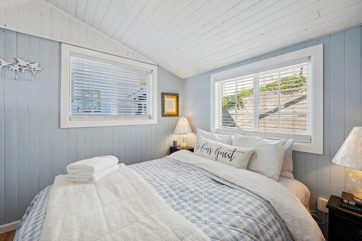 The kitchen is stocked with full-size appliances, a dishwasher, a coffee maker, and all the basic cooking gear, so you're set up for everyday meals or weekend brunches. Just off the kitchen is a dining area with a round table and four chairs. The third bedroom has been turned into a home office with a sleeper sofa, desk, and chair, great if you're working remotely or just need a quiet space during the day.