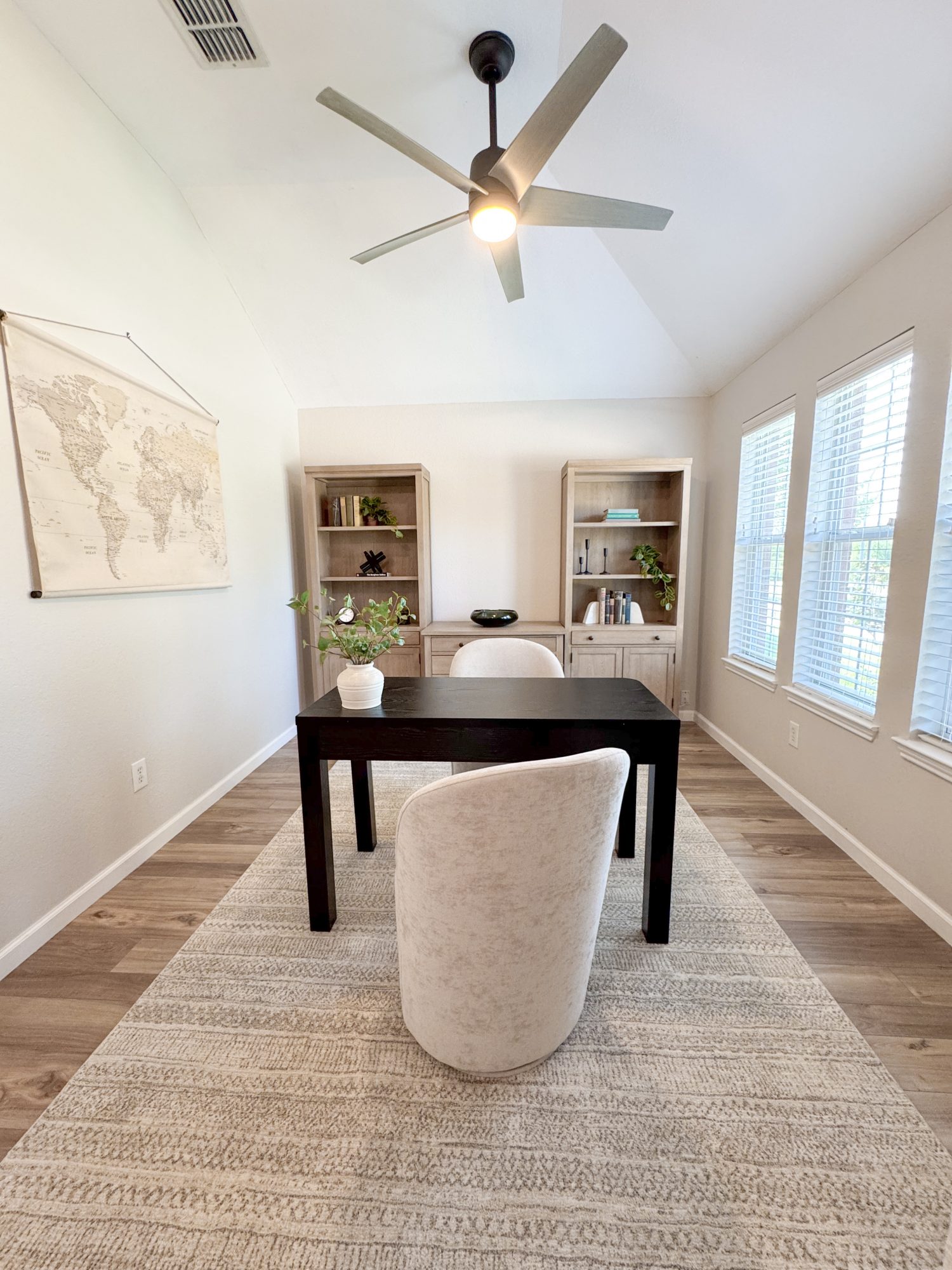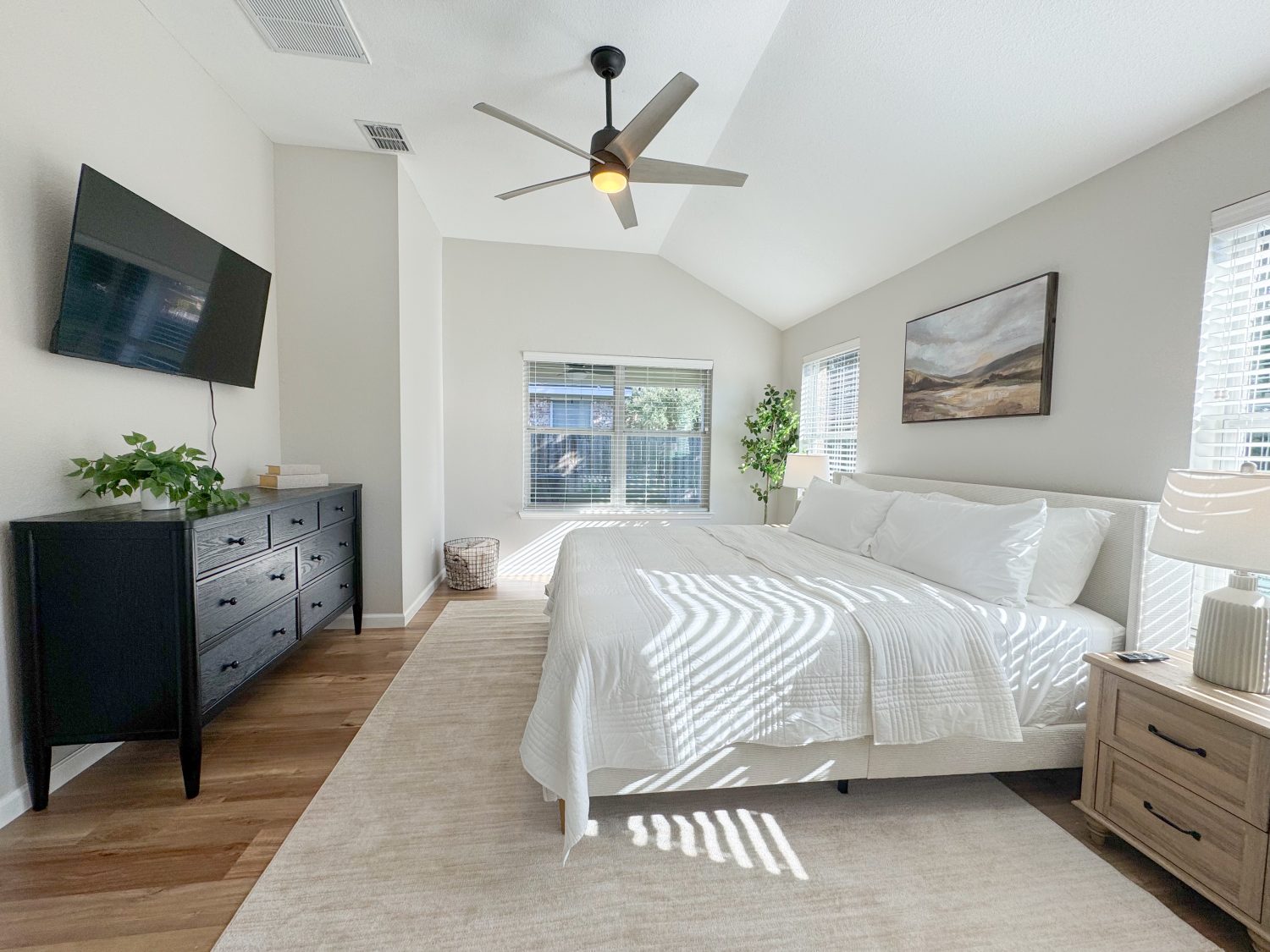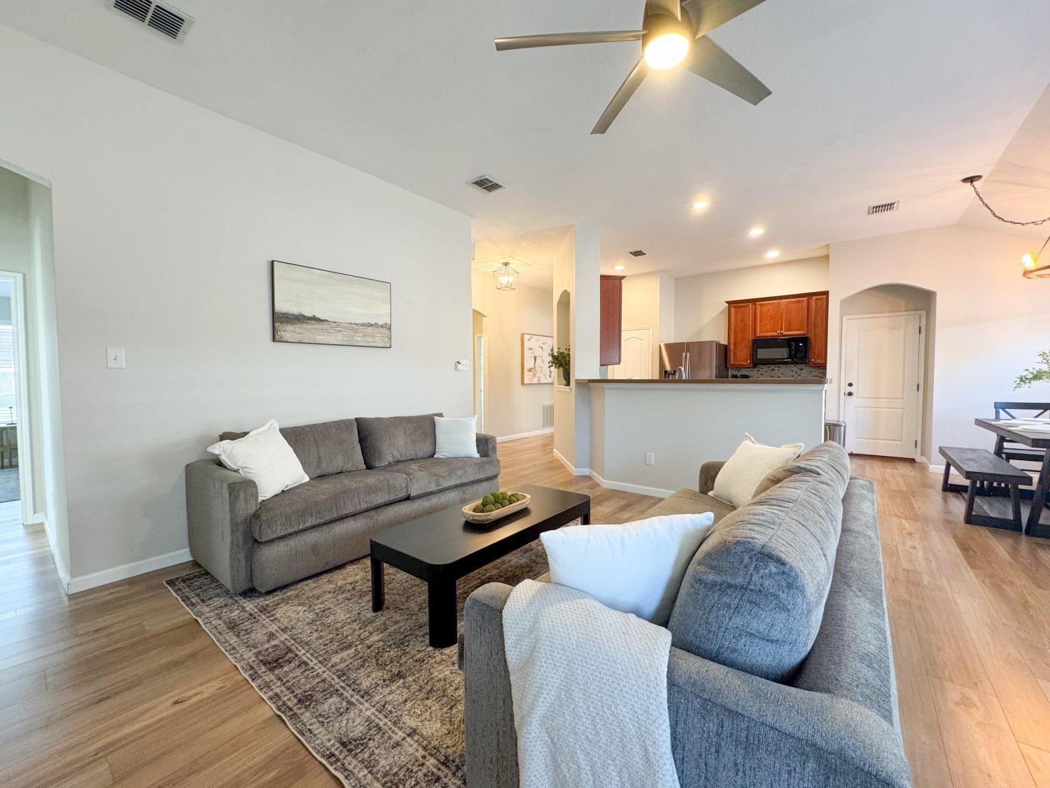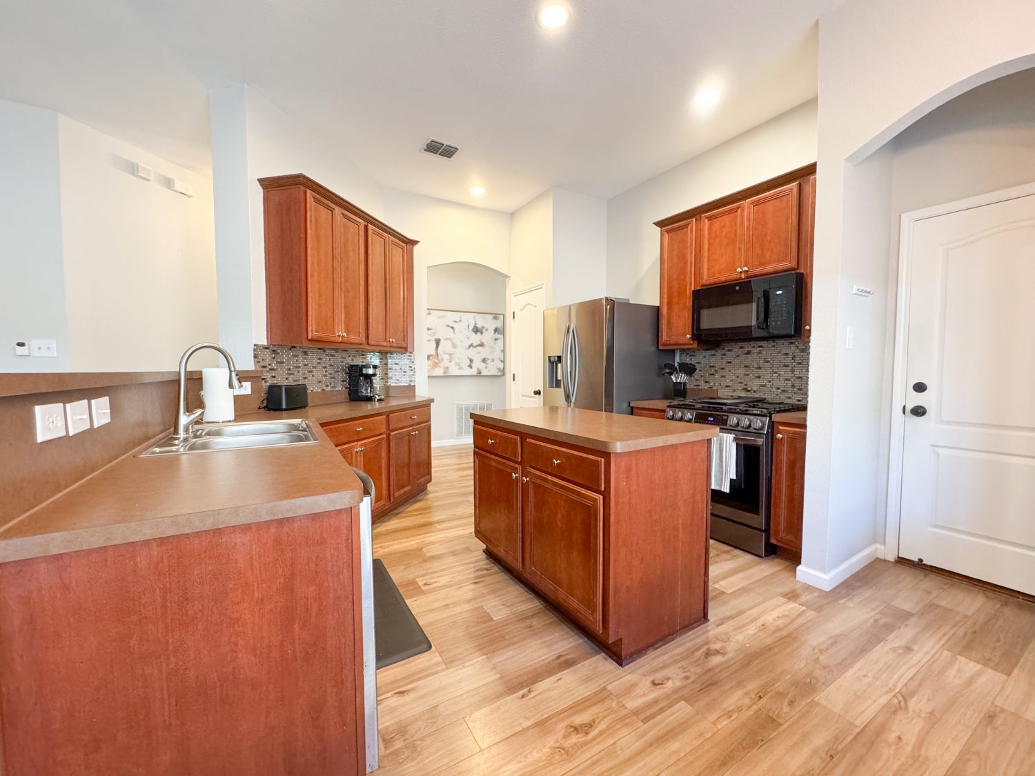 Inviting 4-bed, 2-bath fully furnished home in a quiet cul-de-sac featuring luxury vinyl flooring throughout. Enjoy an open-concept kitchen, living, and dining area with ample storage and new French-door fridge, gas range, microwave, and dishwasher. Primary suite has double-sink vanity, separate shower and soaking tub. Office, laundry with new washer/dryer, 2-car garage, fenced yard, patio. The home sits across from pool, park, playground, near the Alliance shopping and with easy freeway access.