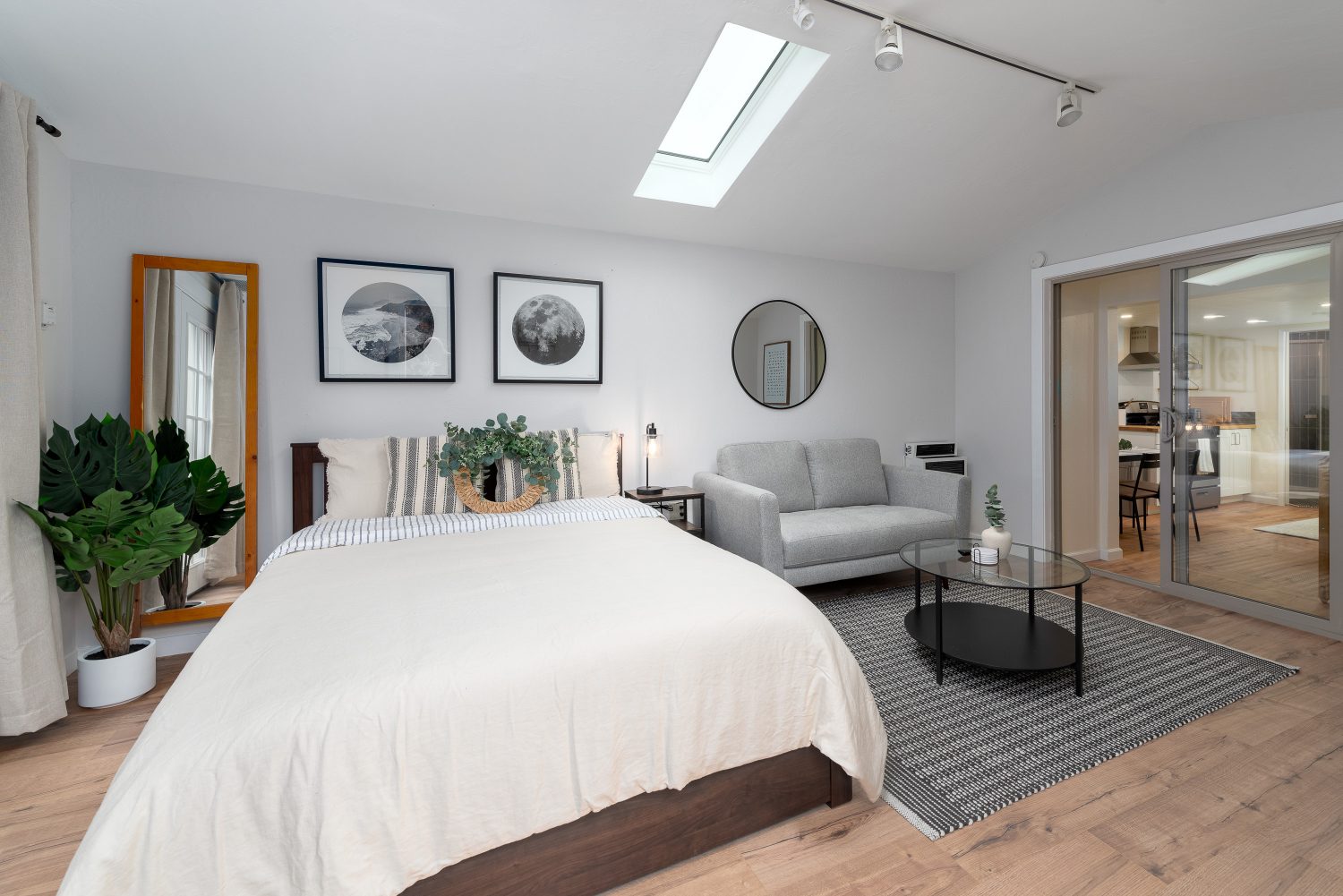 Inside, the studio is filled with natural light thanks to high vaulted ceilings, skylights, and beautiful French doors that open directly to the garden. The layout is open and airy, with a comfortable living and sleeping area, space to unwind with a book or movie, and a cozy dining nook for everyday meals.