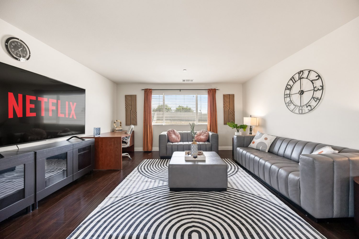 Step inside and find plenty of natural light, splash of fun color, and durable flooring throughout. You'll find a spacious primary suite and a private bath on the first floor, plus 2 master bedrooms upstairs and 2 bedrooms with shared bathroom. There is large upstairs loft featuring a 75-inch Smart TV and a dedicated work desk, perfect for entertainment or remote work. There is a laundry room on the 2nd floor, and plenty of storage to make daily living easy and efficient. There are Smart TV in Bedroom 1, 2, 3 and Master Bedroom.