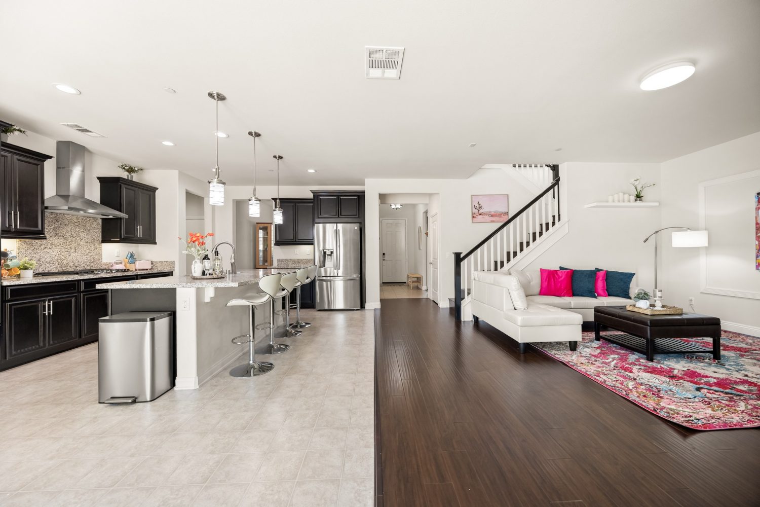 The heart of the home is the open-concept kitchen, equipped with high-end appliances, sleek countertops, an island with bar stools, and ample cabinet space--perfect for casual meals and social cooking. The living room nearby includes a Smart TV, a comfortable sofa, and an ottoman for cozy movie nights or group hangs.
