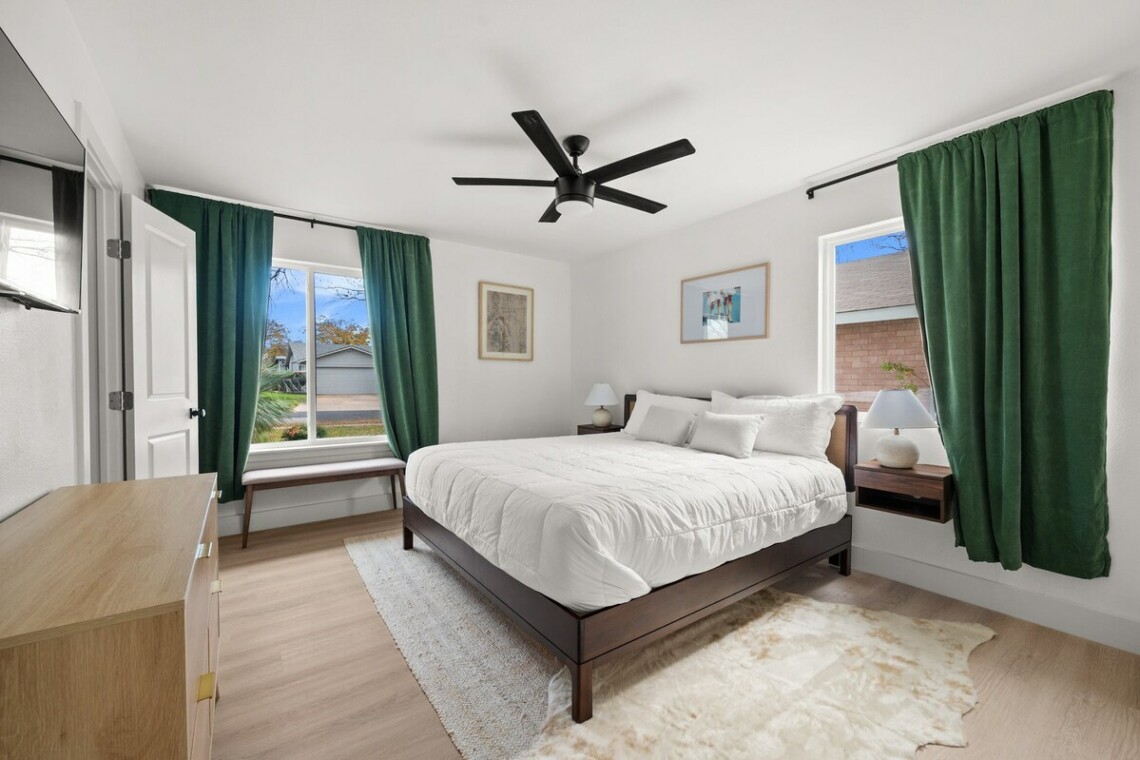 Enjoy this fully remodeled, intentionally designed, peaceful space located near the Domain and many other desirable locations in North Austin. The striking green kitchen will catch you as you walk in the front door, and the cozy, neutral living room is ready for you to come relax. Bring your family for a cup-filling getaway or stay in luxury and comfort while you’re here solo. The backyard is a beautiful place to sit with coffee in the mornings – the neighborhood is quiet and friendly.