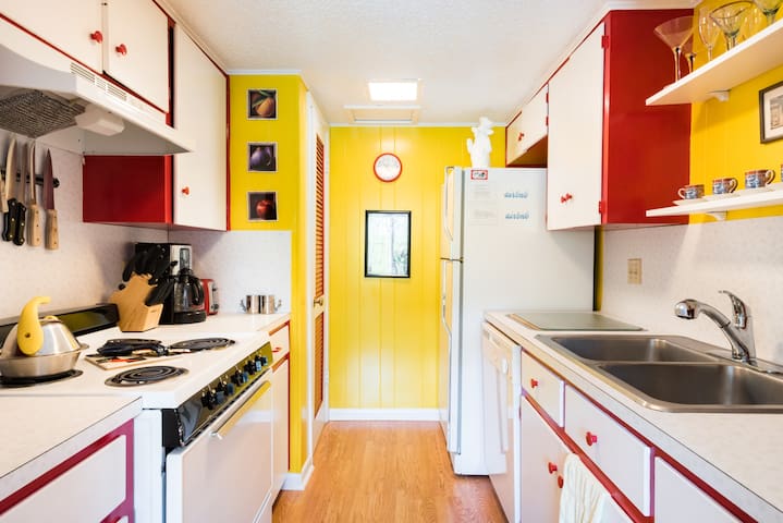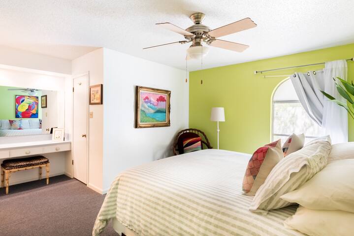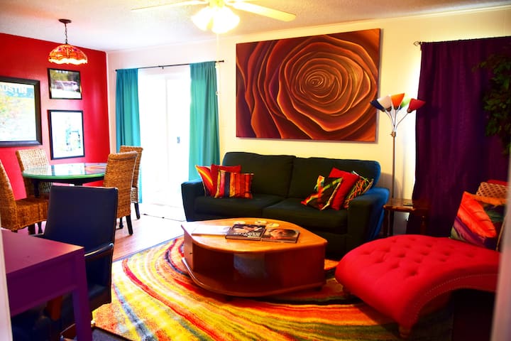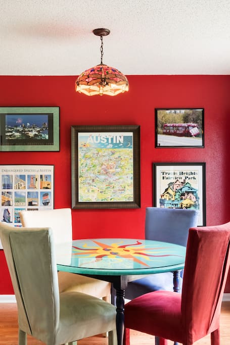 Zilker Park Place is a multicolored two-story townhouse jam-packed with original art and loaded with all the modern amenities. Wake up in a comfy bed and head just around the corner to Barton Springs for a swim or Zilker Park for a morning jog, then cook a meal in the fully-equipped kitchen.