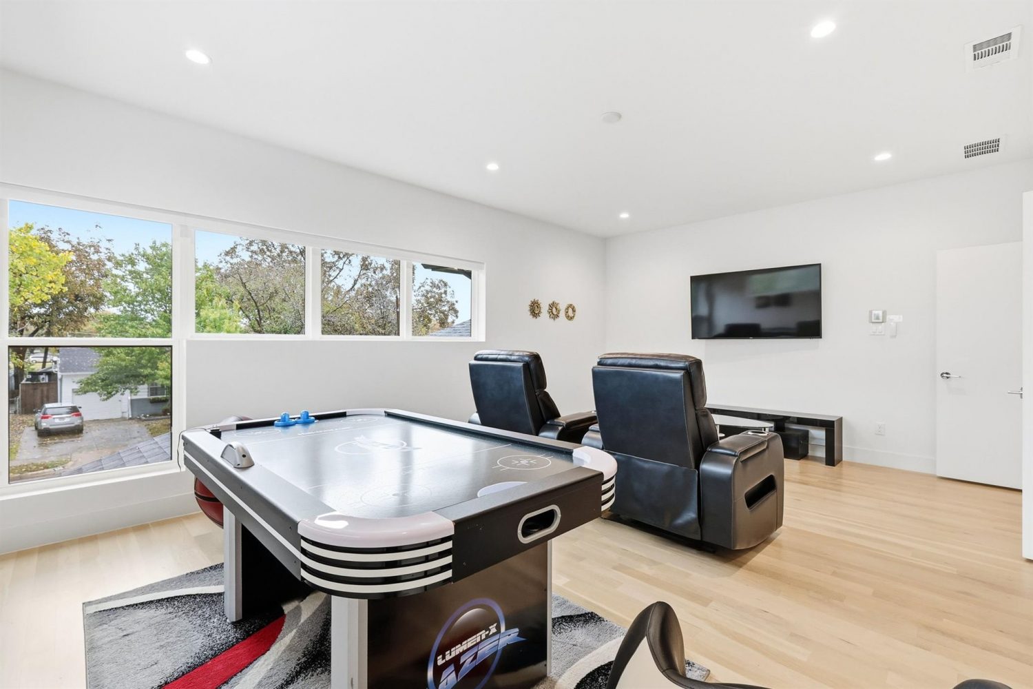 ✔ Cinema room with theater-style seating, an air hockey table, and a mini-fridge for your enjoyment.