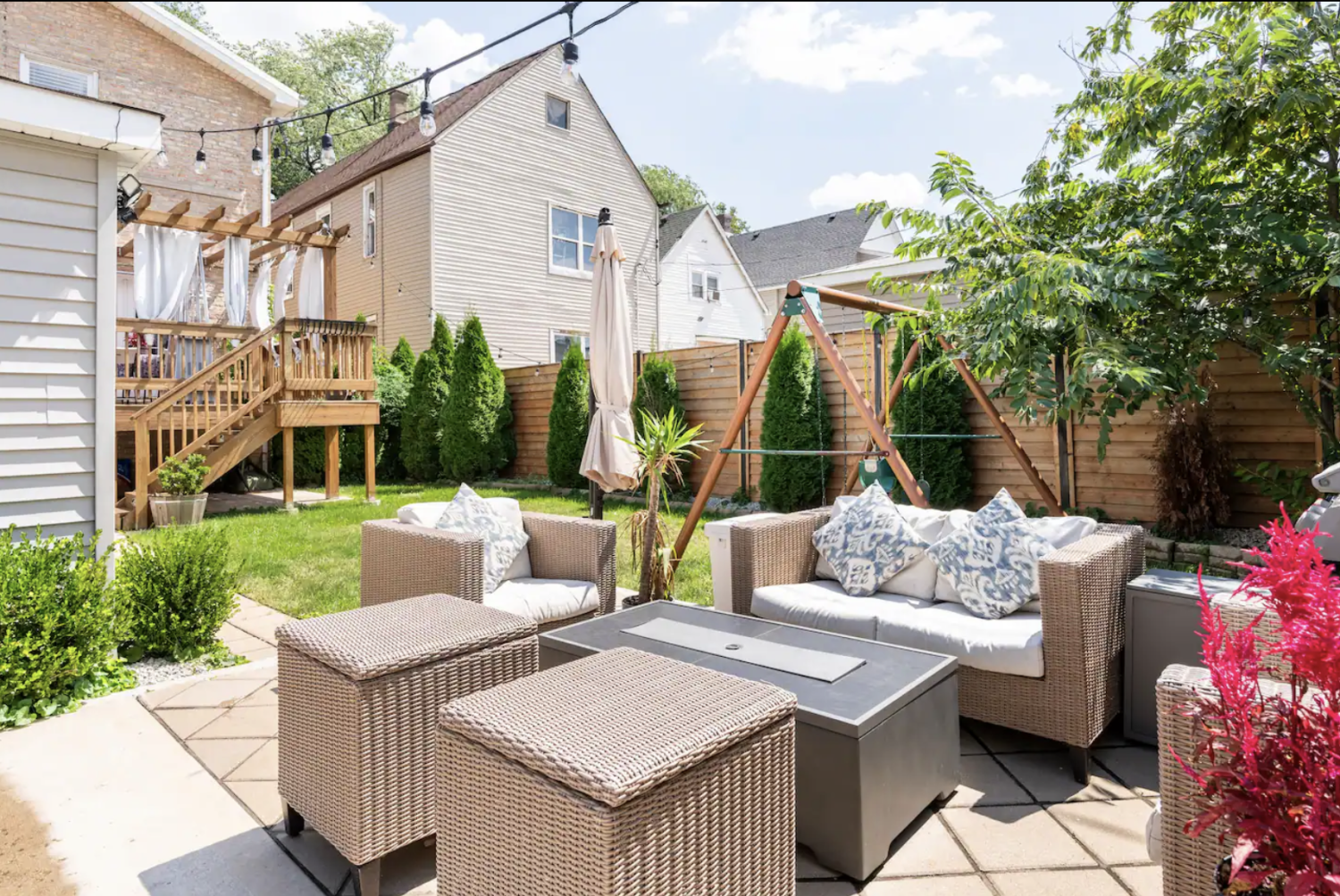 This spacious house/ private compound is situated on a double Chicago lot featuring a pergola deck, fire pit patio area, basketball court, children’s swing set, and more.