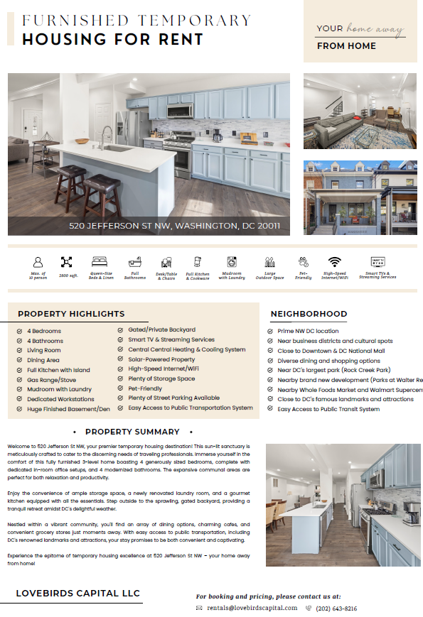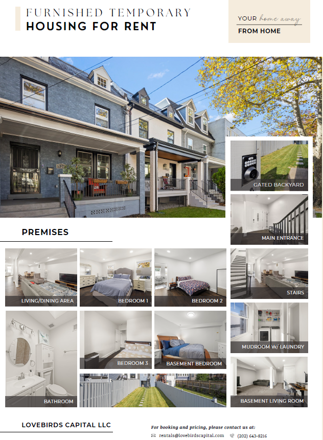Make your travel and extended stay in DC memorable by booking this furnished and cozy rental as a whole unit or on an individual room basis*. Experience the best of the nation's capital with the comfort and convenience you deserve. We're here to make your extended stay in D.C. exceptional! This highly sought-after property is in great demand, so secure your extended stay today to ensure your peace of mind while in the capital city.