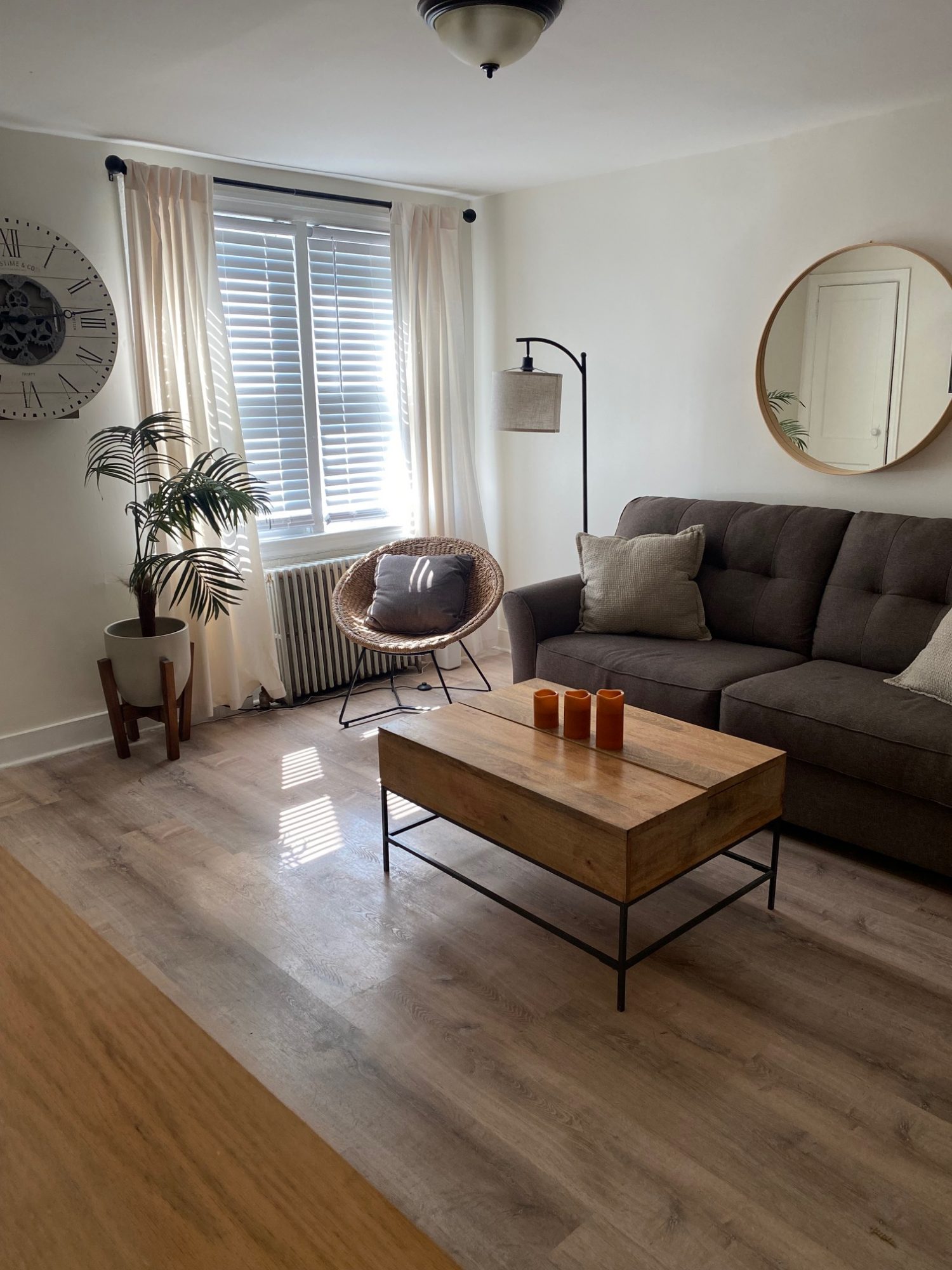 Second/top floor apartment nestled on a quiet block which borders Camden and Pennsauken and just 15 mins away from Philly. A 5-7 min drive to the beautiful Cherry Hill Mall, Walmart, and multiple other shopping centers and a variety of restaurants. Minutes from Cooper Hospital and Rutgers-Camden. Large gated front yard so your pet can run freely. Newly renovated, cozy, farmhouse themed apartment above a quiet long term tenant. The living room includes a cozy sofa, accent chair, throw pillows, and blanket. The place also features two windows per room, air conditioning, fans, blackout curtains, desks, and lamps. Updated bath and kitchen that features new cabinets, full fridge, portable mini washer and drying rack, and breakfast bar.