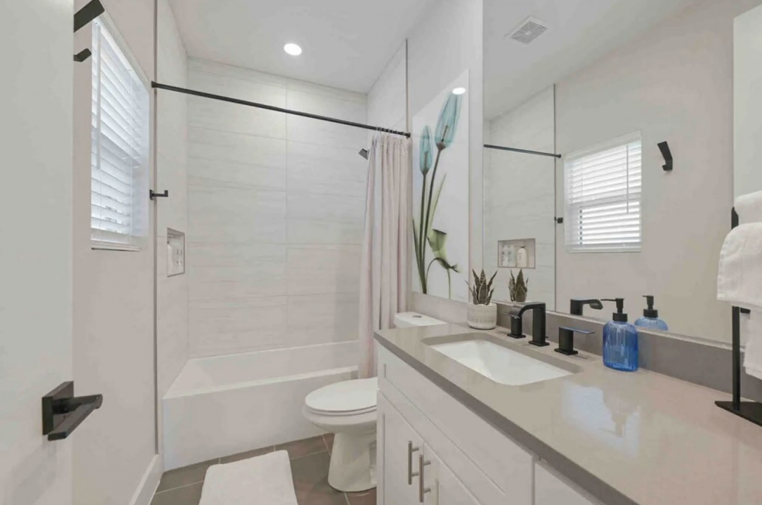 - A private en-suite bathroom with a shower-tub combo, large vanity, toiletries, hair dryer, plush towels, and makeup towels