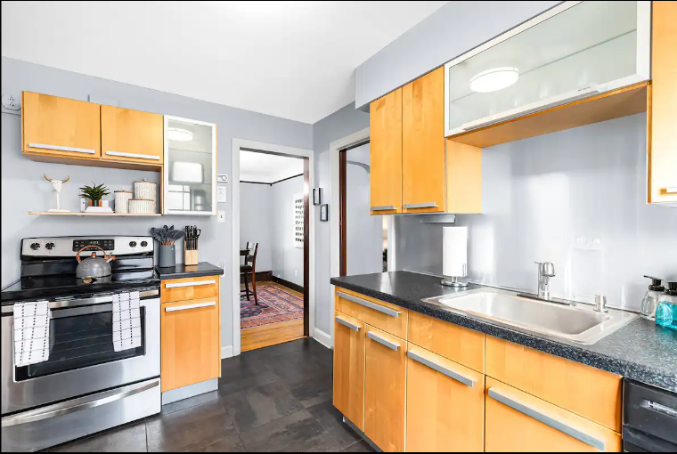 As soon as you enter the charming flat, you'll enter the newly renovated kitchen. The Kitchen is stocked with all the essentials to cook your favorite meals at home. It is designed and furnished with numerous modern and comfortable amenities, while maintaining the original charm of the 1920s built home, that complement the fantastic Royal Oak location.