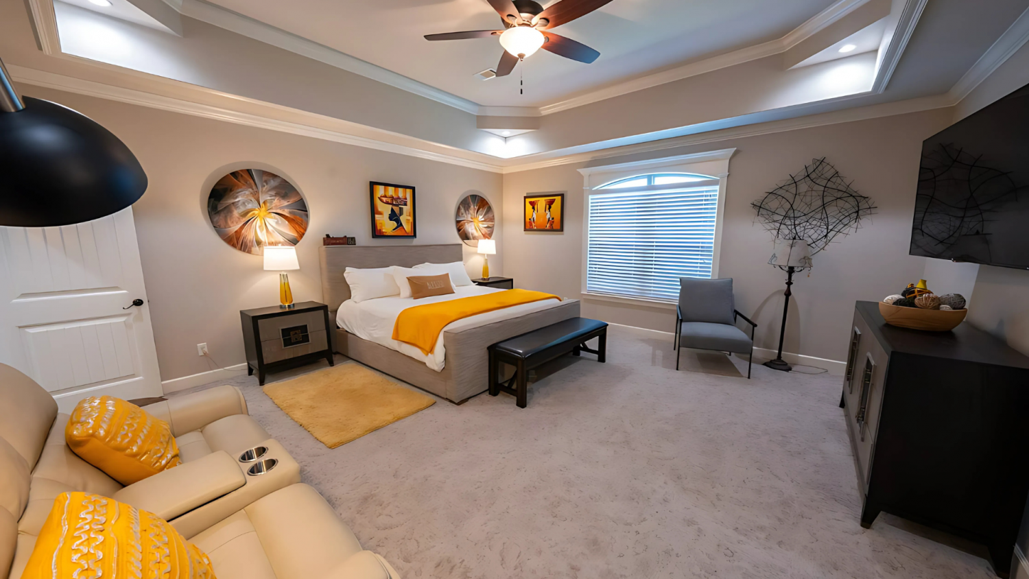 The interior of this home exudes a warm, modern charm with vibrant accents and unique decor. The open-concept layout features a spacious living area with a striking red sectional and contemporary African-inspired art, creating a bold yet inviting ambiance. The space is further enhanced by a cozy fireplace, wood-paneled walls, and natural light streaming through large windows.