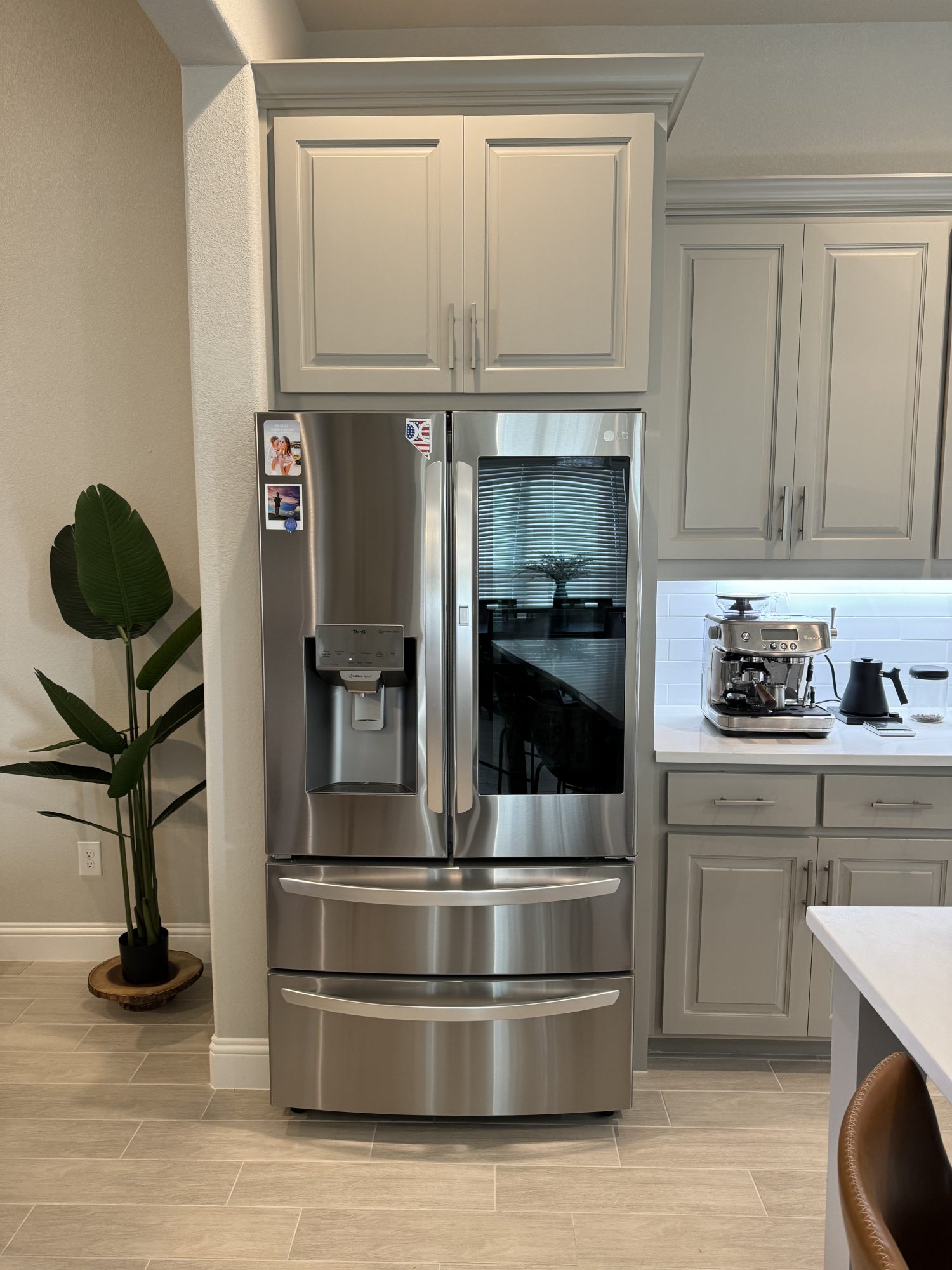 The heart of the home is a chef's kitchen that will make you actually want to cook: expansive quartz island with seating for three at the bar and six at the table, soft-close greige cabinetry, subway tile backsplash, stainless appliances (including a French-door fridge with water/ice), glass pendant lighting, and a walk-in pantry. The kitchen flows seamlessly into the living and dining spaces, making entertaining effortless.