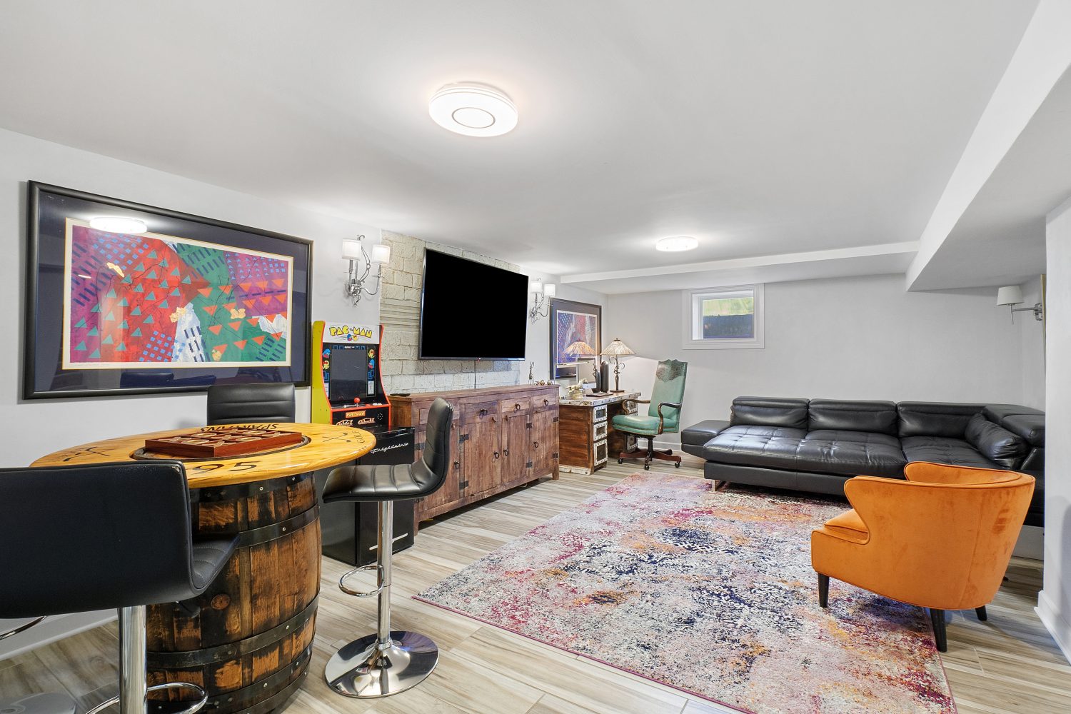 Downstairs has a large living room with 2 bedrooms. 1 is ideal for kids with 2 twin beds. The other is a master suite with an attached bath.