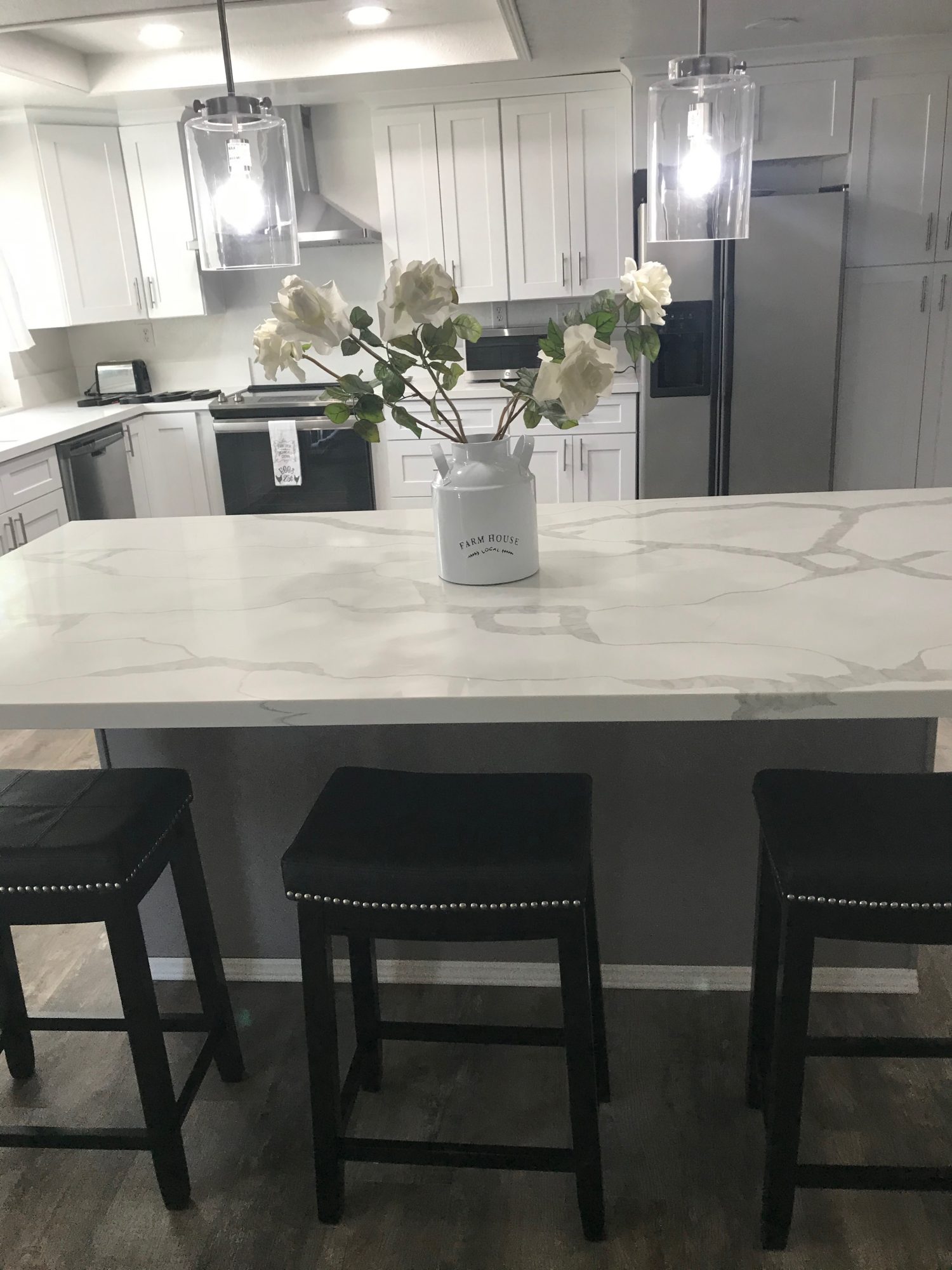 In the Kitchen white quartz counter tops, shaker cabinetry an Island with bar seating, a pantry and stainless steel appliances. Newly furnished, sliders, air & heating. Step outside to a large yard, covered patio, dog run and rear access to trails, park and riding arena all private!