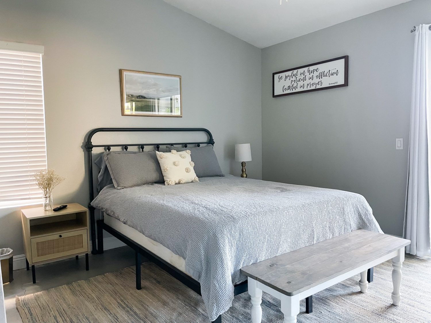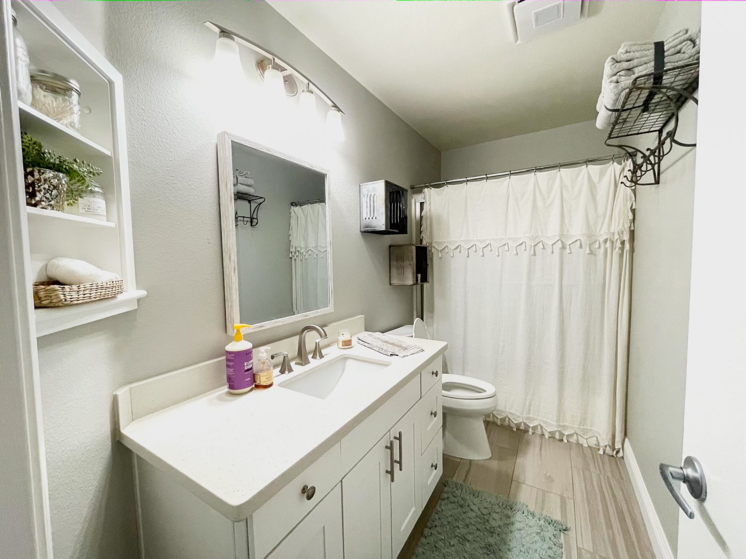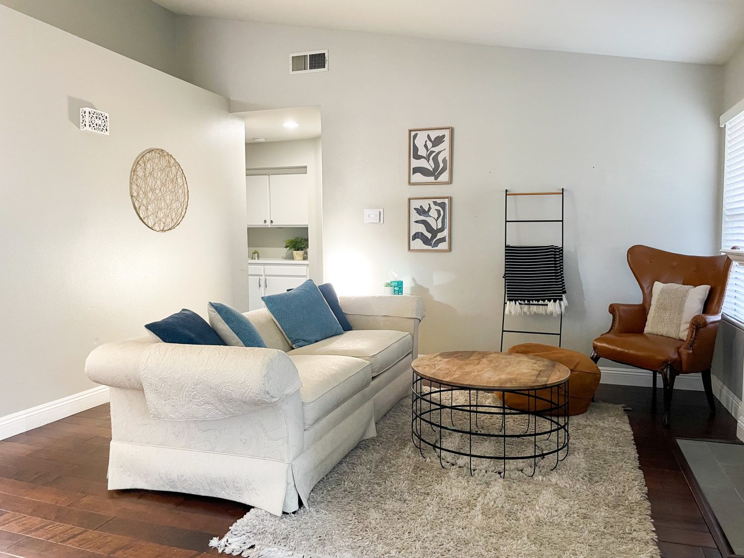 Fully remodeled, single story view property. Pet-friendly with fenced back yard. Vaulted ceilings, hardwood floors, and fresh designer paint colors. The kitchen has been redone with upgraded counter tops and tile backsplash, new cabinets with glass inserts, and stainless steel appliances which all coordinate with the family room and modern fireplace. Three spacious bedrooms recently painted and carpeted. Both the master bath and secondary bath have updated tile flooring, vanities, mirrors, faucets, showers, and lighting. Finished 2 car garage with and epoxy flooring. Outside pergola cover with mountain views. This home is a fully furnished, all-inclusive rental: All utilities, WiFi, gardener, bedding, towels, kitchen supplies, etc. are covered.