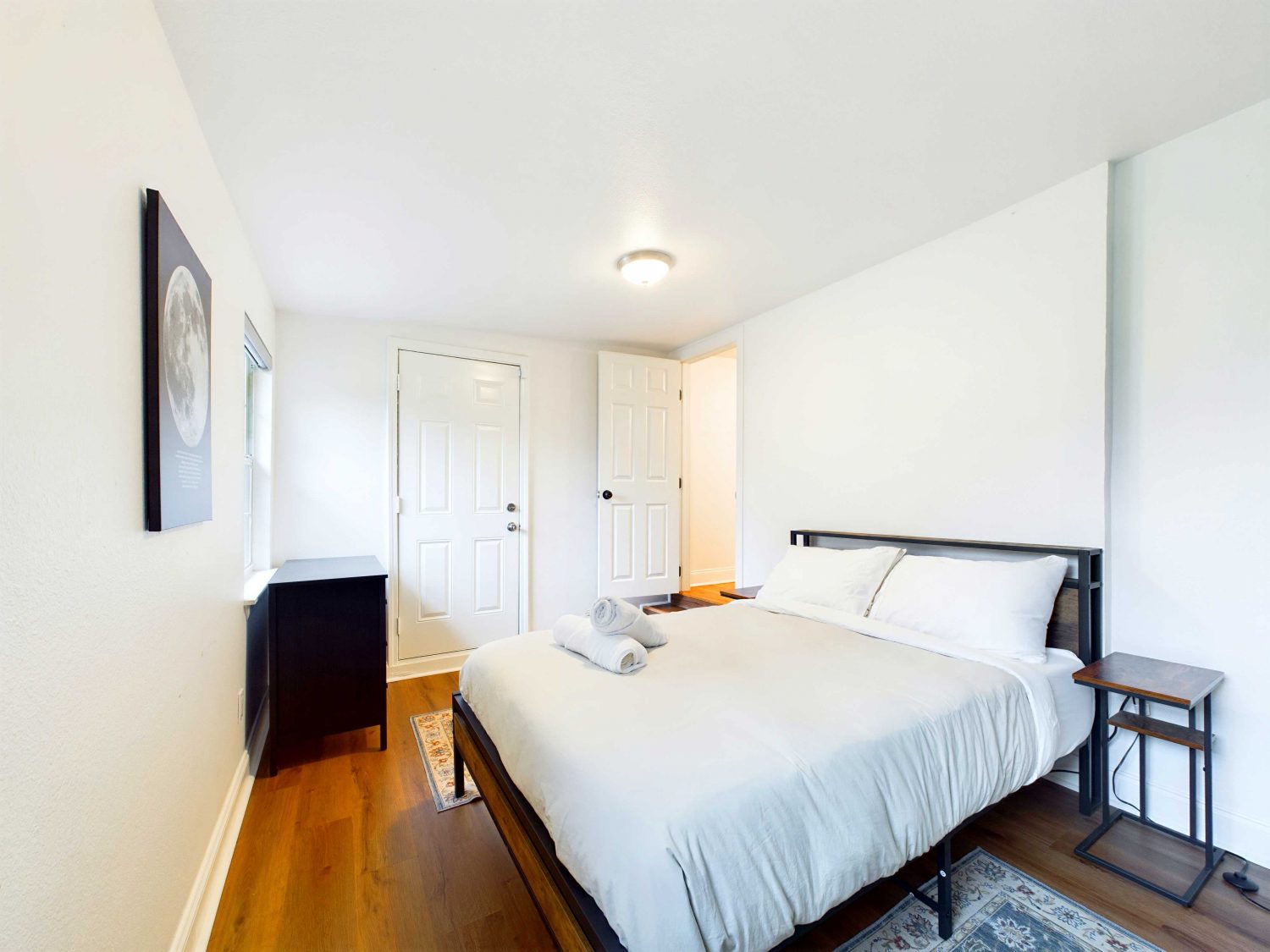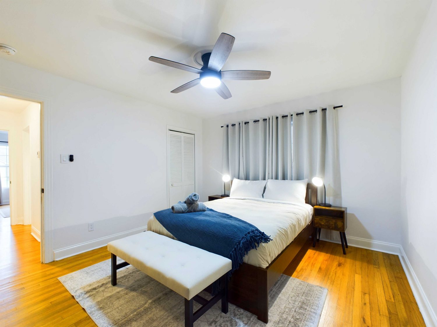 Enjoy a restful stay with comfortable beds and plush linens in each bedroom, ensuring a good night’s sleep. The living room features a warm, inviting fireplace and a smart TV – perfect for cozy movie nights or unwinding with your favorite shows. Prepare delicious meals in our spacious, fully equipped kitchen, stocked with cooking essentials for your convenience. With two bathrooms, you’ll have optimal space and privacy, making it perfect for short visits or mid-term stays.
