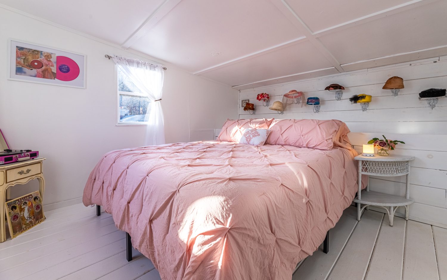 ● The "Pretty in Pink" Room (Upstairs) - 1 King Bed, Closet, Bureau, Workstation*, “Pink” Record Player, Water Views