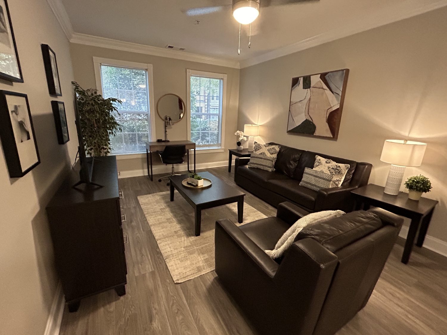Lakeside at Milton Park is conveniently located in the heart of Alpharetta and one block from North Point Mall. Our fully furnished apartments include a stunning heated pool with Romanesque courtyard, endurance fitness equipment with aerobics studio, executive business center and conference room with wireless Internet access, clubroom with theatre and billiard table, central lake with beautiful scenic views, clothes care center, car care center, recycling centers, and on-site café and dry cleaners. This fabulous 1 bed/1 bath with desk area is located on the 1st floor with King size bed and spacious living /Dining area. A true "Home Away From Home"