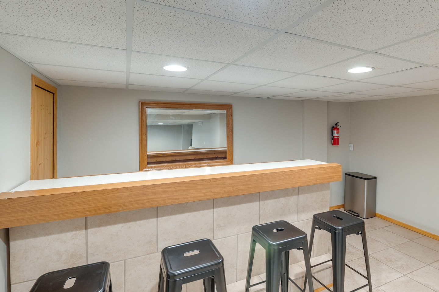 Finished basement with a wet bar and TV setup for game day excitement