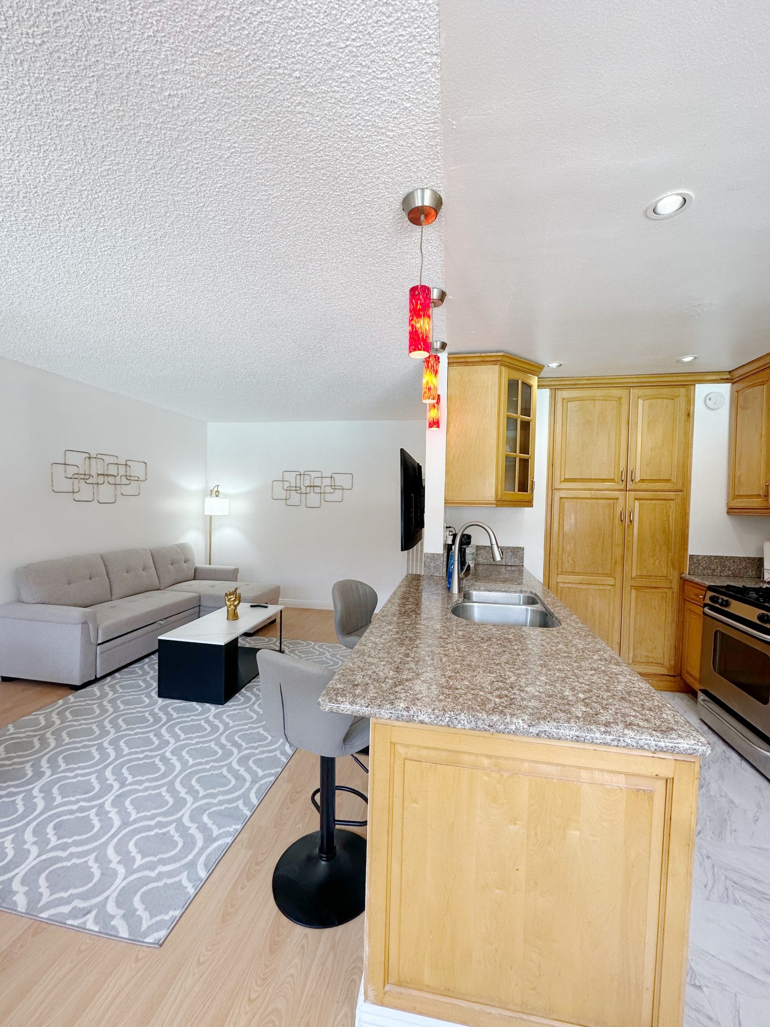 Amazing peaceful retreat with a pool view. Everything you could think of in the home down to Keurig. Large updated with new furniture. 1 bedroom, 1 bathroom, 3 large closets, pull out couch and desk with printer for work. Building amenities include, pool, jacuzzi, clubhouse with pool table, ping pong, foosball, sauna, vending machine, gym, private parking. Can walk to all kinds of food, shopping and entertainment. 2 blocks from Manhattan Beach