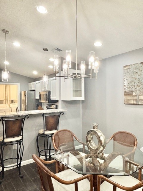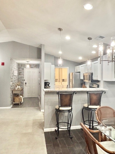 This is a thoughtful fully furnished two-bedroom, two-bath condo designed to make daily living easy and comfortable. The main living area feels open and inviting, with a 75 wall-mounted TV perfect for streaming, relaxing, or gathering with friends. An electric fireplace gives the space warmth and ambiance, while heated floors add a touch of comfort that makes chilly mornings much nicer. A breakfast bar with two stools and a Keurig coffee station is perfect for casual meals or a quick morning pick-me-up.
