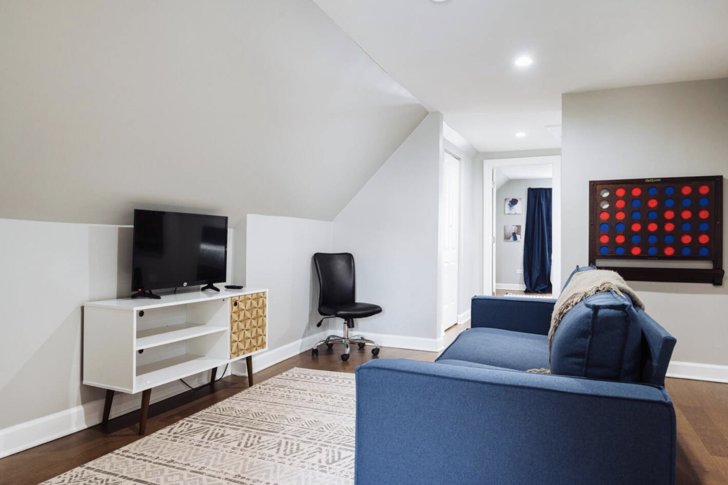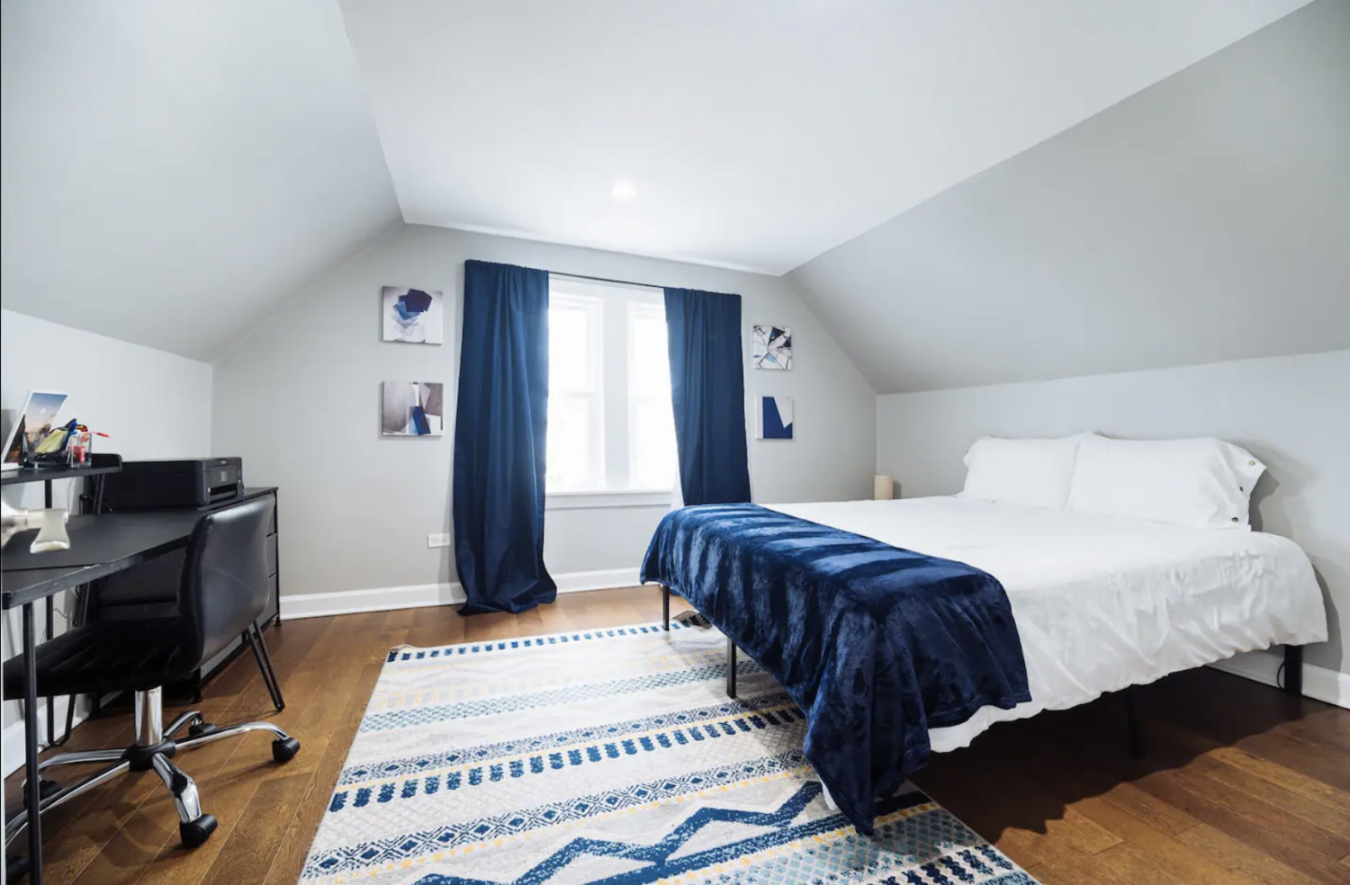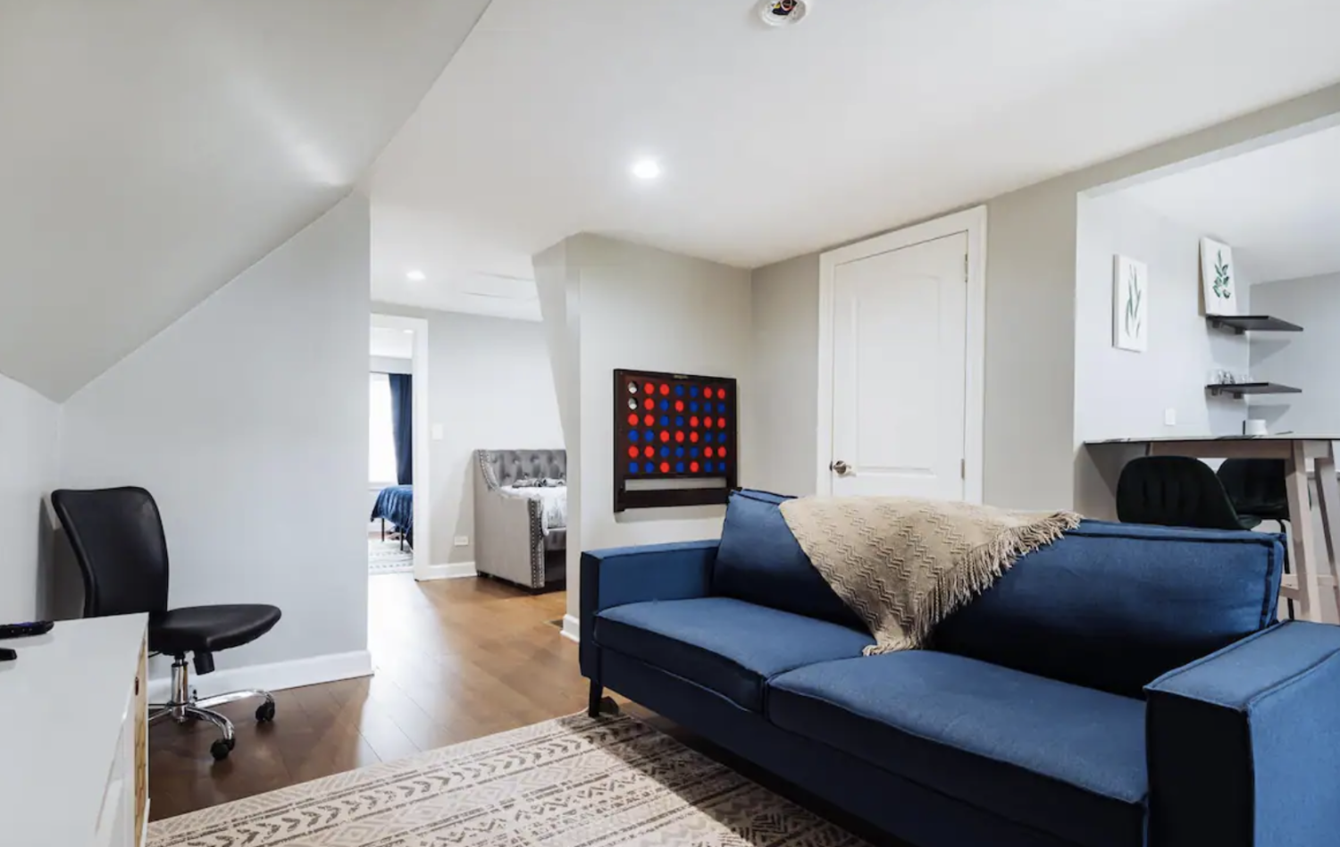 320. This fun, cheerful apartment is perfect for your Chicago trip, featuring one elegantly decorated bedroom with a queen-size bed, luxury linens, stylish decor, new vinyl floors, and a workspace with a printer. Additional sleeping areas include a living room couch, a full-sized bed in the sleeping nook, and a queen-sized blow-up mattress with luxurious linens and fluffy pillows. The apartment also has a small kitchenette with most essentials, but no stove, ensuring a comfortable and enjoyable stay for you and your family.