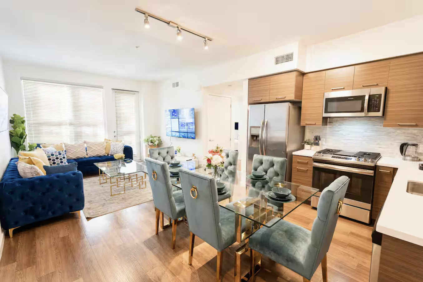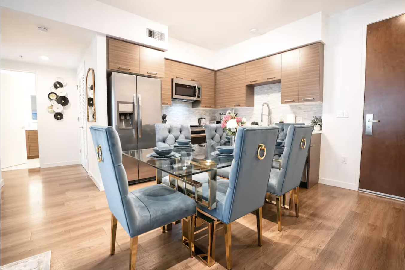 Hollywood and Downtown LA are only a 10-min drive away. Local entertainment includes Sophie Stadium, Americana on Brand, Galleria, Hollywood Sign, Universal Studios, Crypto Arena, and more! The apartment features three TVs, Wi-Fi, a washing machine and dryer, a coffee machine, two queen-size beds, a dishwasher, and crockery. Nice restaurants are around.