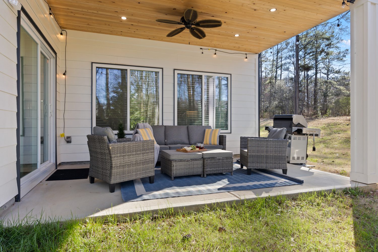 ➝ Private backyard with comfortable seating & string lights for cozy evenings