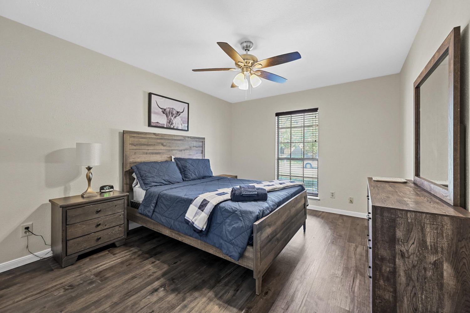 The huge master bedroom includes 1 king and 1 queen bed and an en suite bath with granite countertop and updated shower with glass surround. The 2 secondary bedrooms have queen beds. The updated kitchen is fully stocked and includes seating for 4 in addition to the formal dining area that seats an additional 6. There's even a bar for those who like to entertain, and a desk/chair for those who need to work while they play! The living room includes a comfy sectional couch and smart TV. Guests will have access to a 2 car garage with personal garage code.