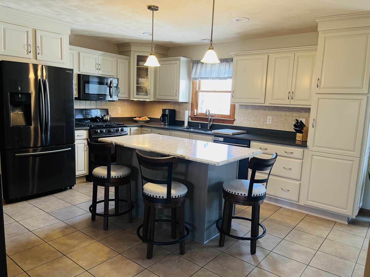 First floor has a fully equipped kitchen, large island and a half bath in hallway. A dining area for formal dinners if preferred.