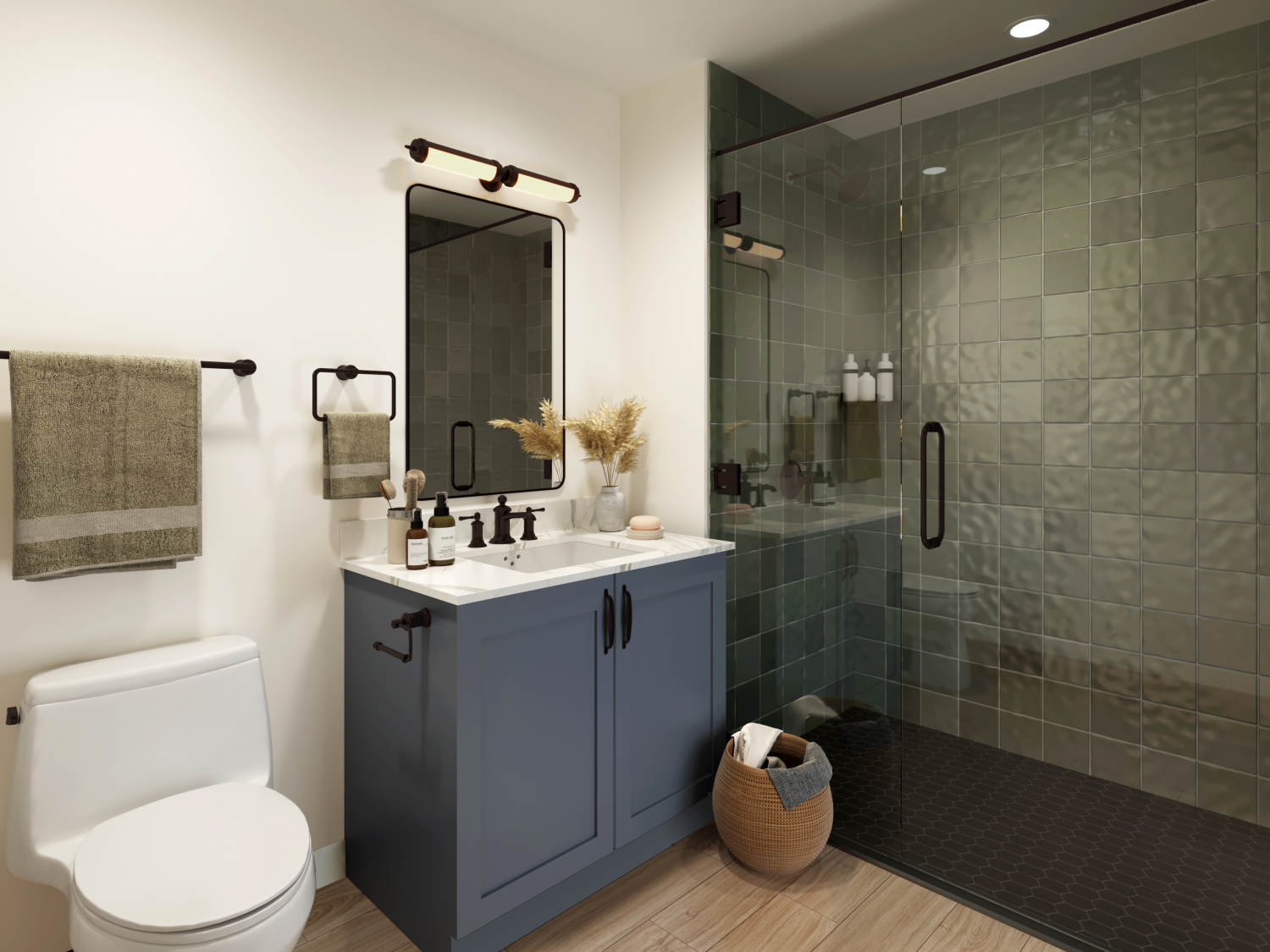 Memoir Wedgewood Houston provides Studio, One-Bedroom, and Two-Bedroom apartments with unique touches, including antique brass hardware, custom tile, and Ivory or Navy interior finishes.