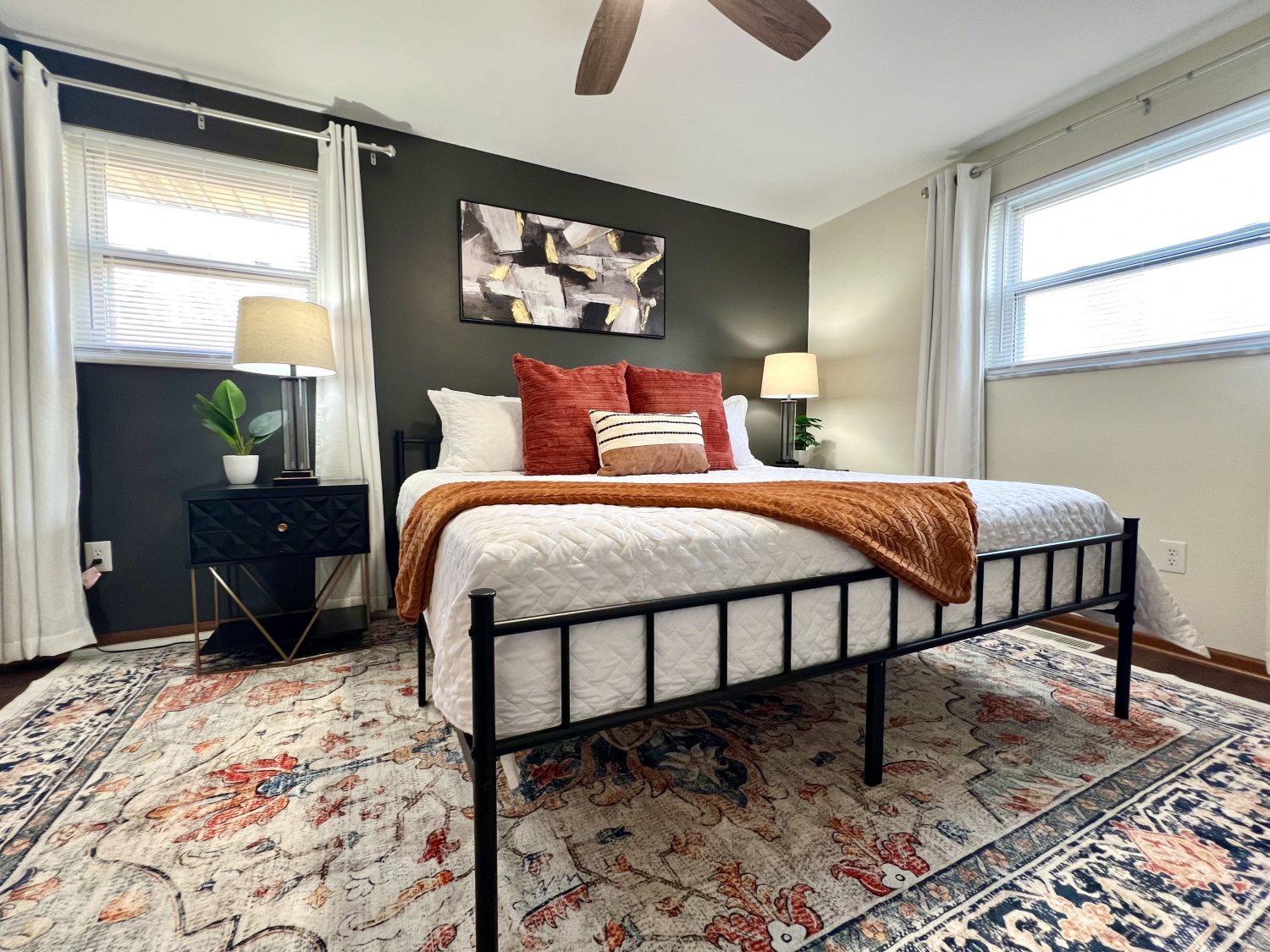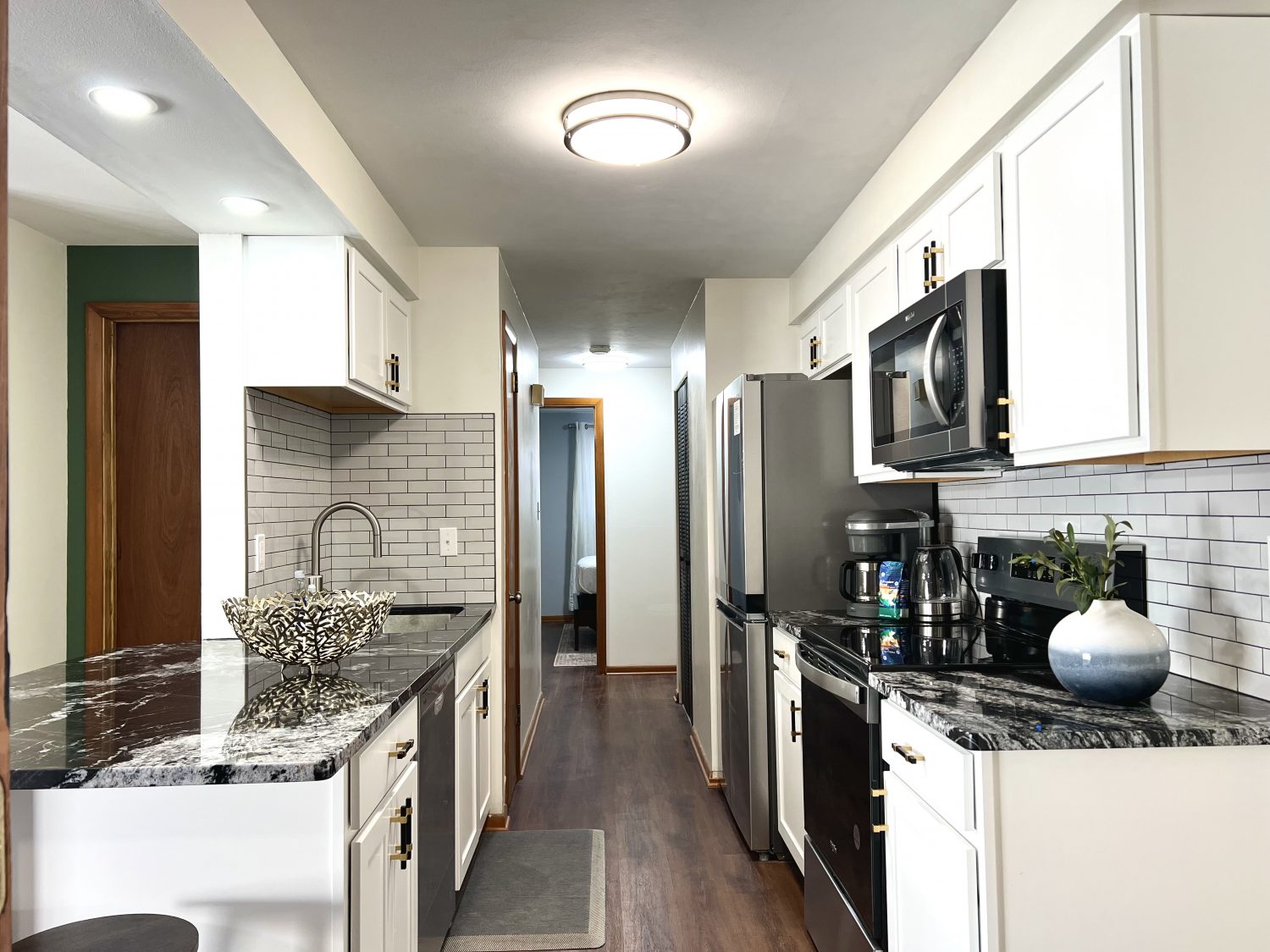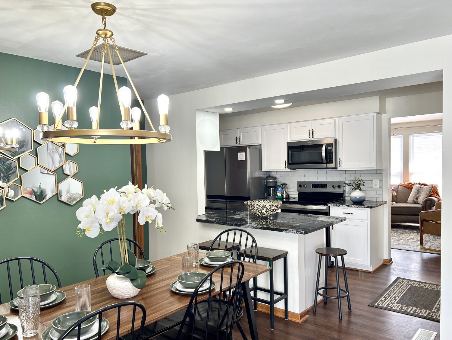 Welcome home to the elegance of mid-century modern living! Enjoy cooking in the new luxurious kitchen featuring sleek granite countertops and new appliances! The primary king suite offers a 55" smart tv and half bath. The cozy living room is perfect for relaxation, playing a game, or unwind to a favorite movie on the large screen smart TV. Located just minutes to shopping, restaurants, and I-70, making it the perfect blend of convenience and accessibility!