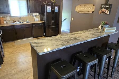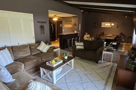 This home is very cozy, recently updated, nestled in a great, quiet area. 3 bedrooms have 100% memory foam mattress queen beds, & in the 4th bedroom are 3 pairs of twin bunk beds, with the master having a private bath. I enjoy cooking so I try my best to stock the kitchen with what I would want in it, complete with a Betty Crocker cook book. Kitchen also has a 12 cup coffee maker and a Keurig. In the family room is a 55"" 4k Ultra HD tv with Roku, & DVD player. Basement has 3 game tables & a 55"" TV with Roku & retro game console. Newer AC & appliances. Your comfort and safety are important to me. Smoke detectors in every bedroom & 4 fire extinguishers throughout. Book with confidence as I have been renting homes for 14 years, I'm confident you'll love your stay in this 2,476 sq ft house.