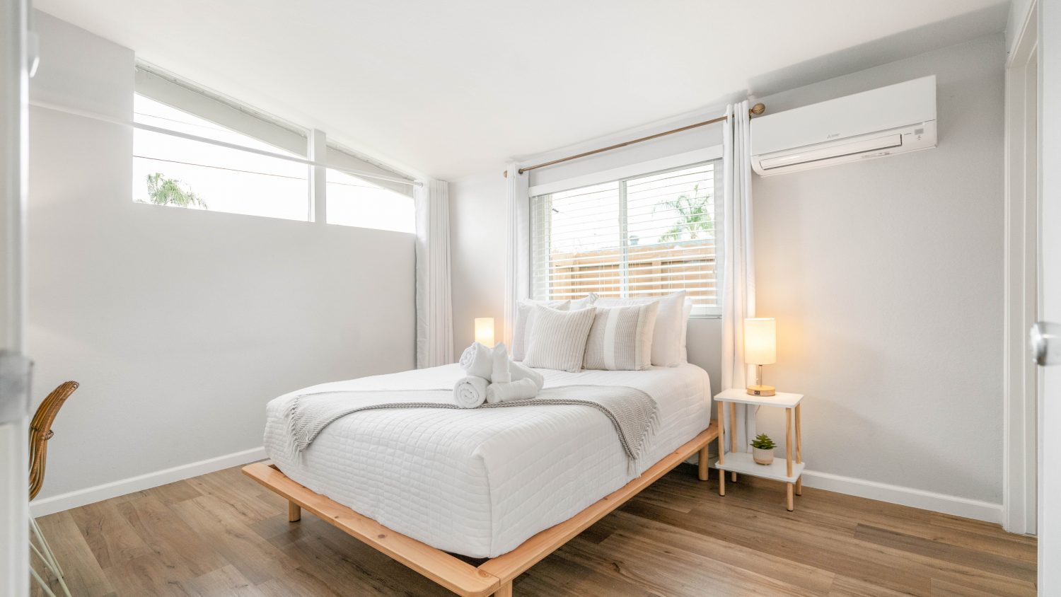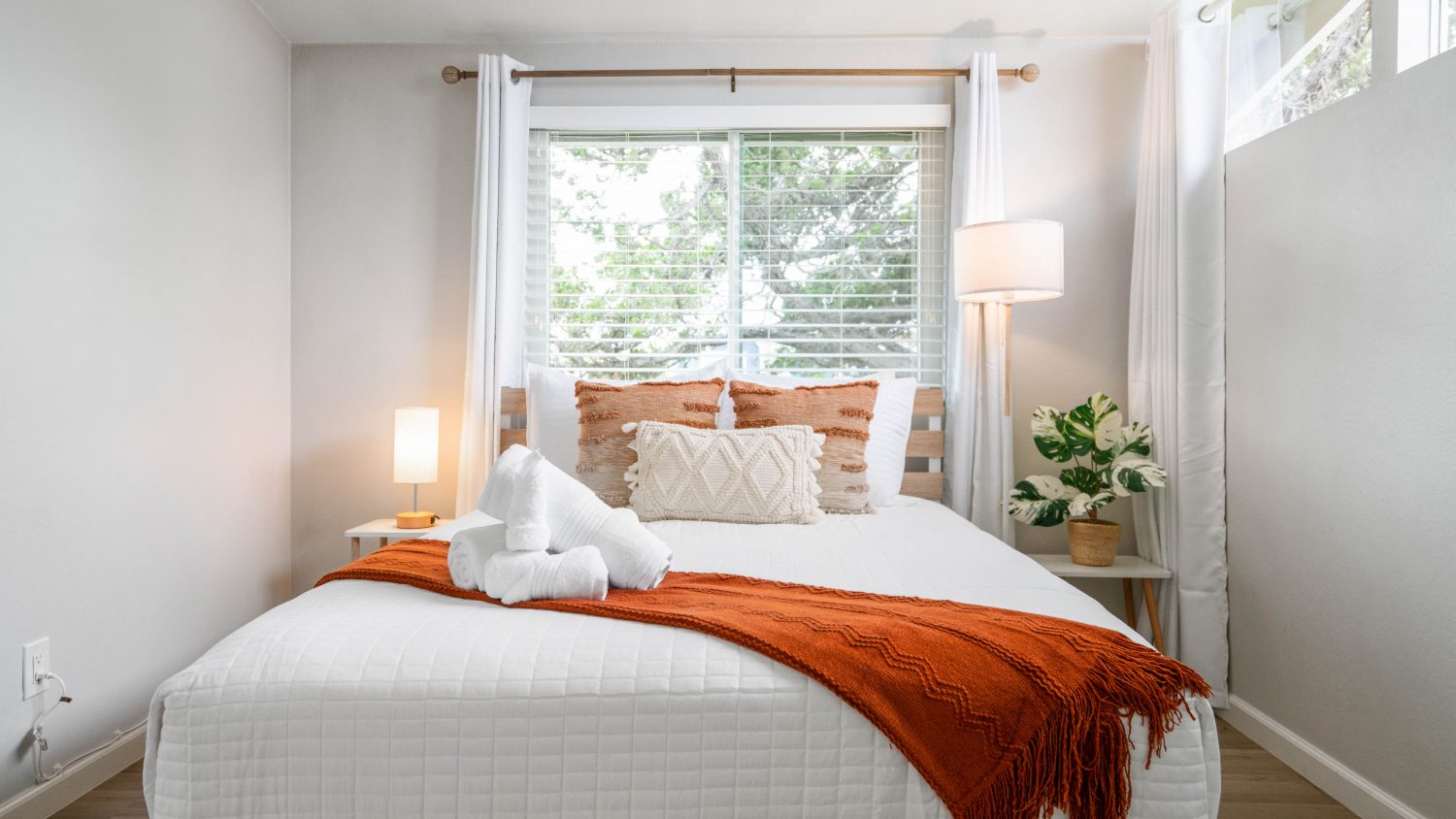 Each Bedroom is furnished with a queen sized premium foam hybrid bed from Nest Beds, a fan, a laundry basket, and blackout curtains. The home can accommodate up to 6 guests based on double capacity in each bed. There are a variety of different pillows to choose from to ensure you find the right one.