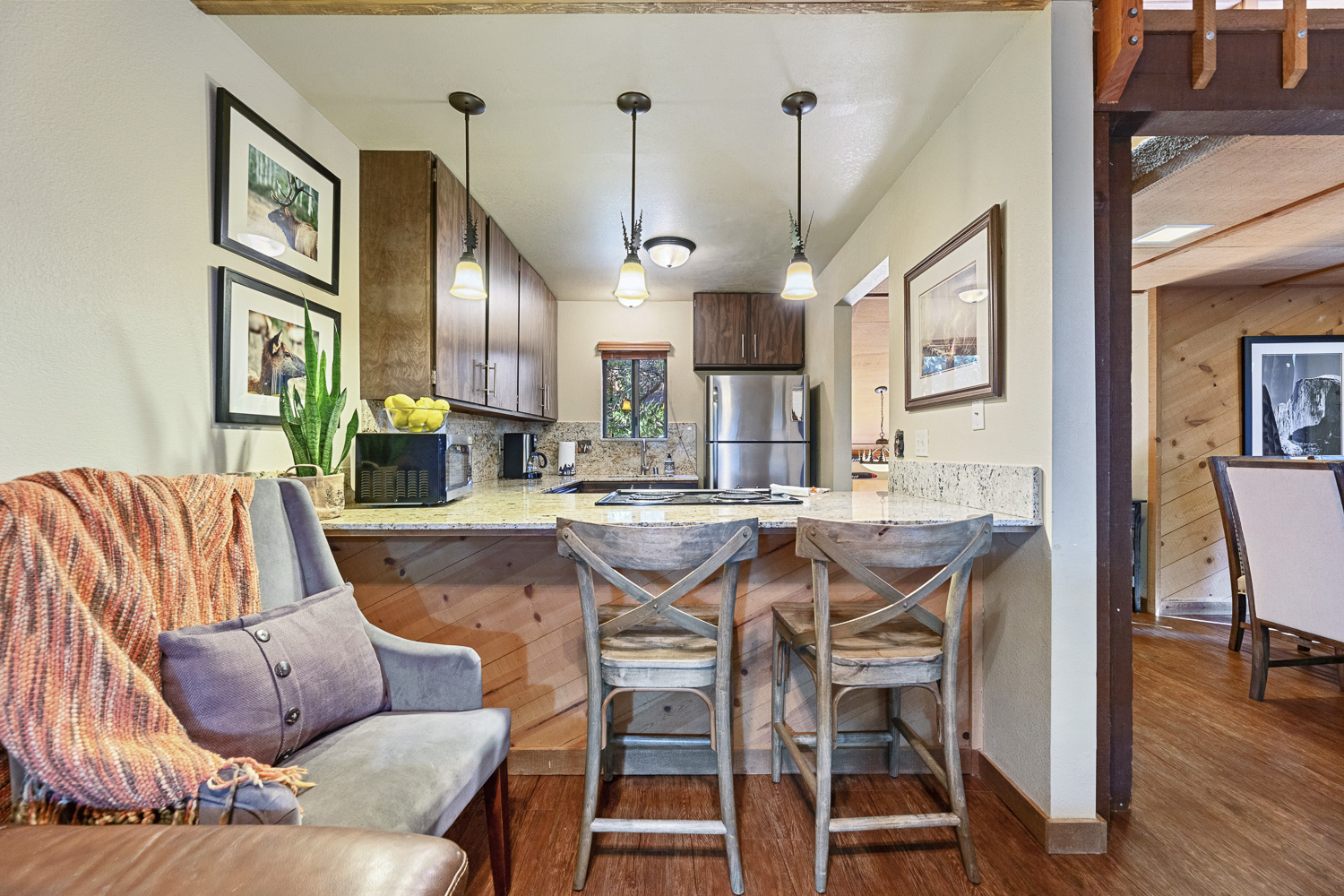 The unit features 3 levels that are open and functional. Downstairs there are two spacious bedrooms with queen beds and two bathrooms. Upstairs there is a spacious living room, kitchen, dining area and a loft with a queen size bed. The top floor also features an oversized patio deck that looks into the Sierras.