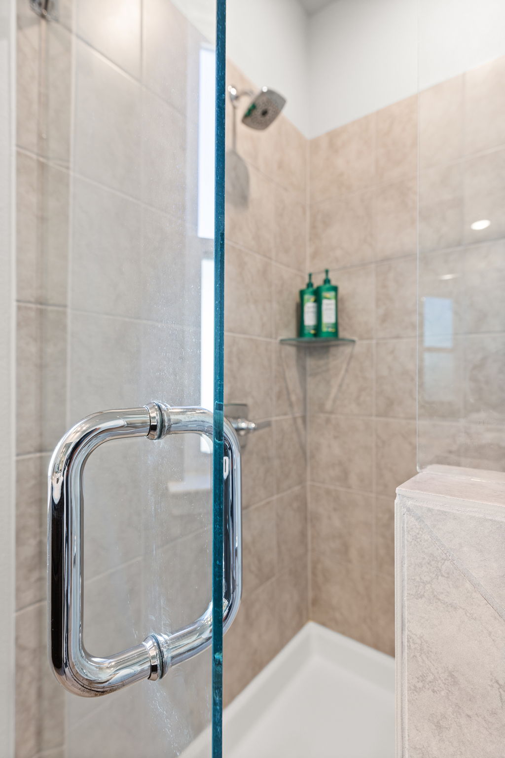 A full bathroom with shower/tub combo stocked with fresh towels, shampoo, conditioner, body wash, and essentials.