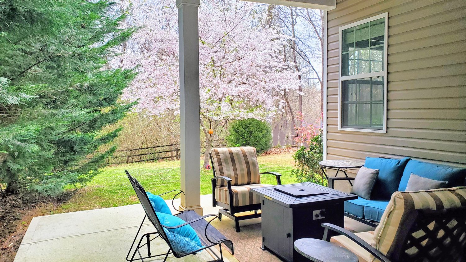 - The backyard extends to a private camping spot, a nature path, and access to the greenway.