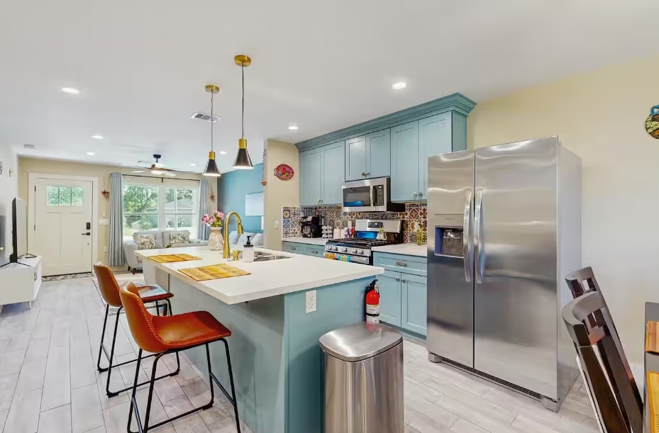 This inviting Houston duplex offers a comfortable and stylish retreat for your visit! As you approach, you'll notice the attractive brick exterior and a convenient driveway leading to a garage. The private fully fenced backyard provides a relaxing outdoor space. Inside, you'll find a dedicated workspace , perfect for catching up on emails or planning your Houston adventures. The bathrooms boast modern finishes, including a stylish shower with marble-look tiles and gold fixtures .