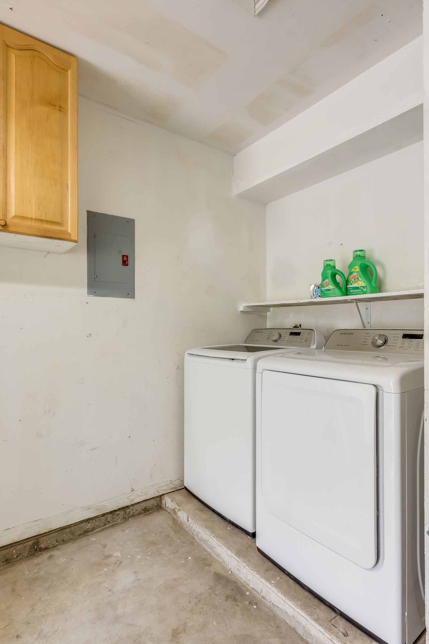 The garage can fit one vehicle and includes a full-size washer and dryer for your laundry needs, with complimentary starter detergent provided for your convenience. There is an additional parking spot in the driveway, while street parking is plentiful.