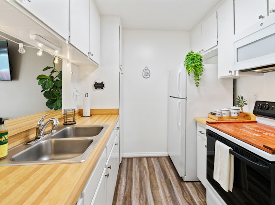 -Culinary delights await in the fully stocked kitchen with stove, oven, refrigerator, microwave, electric kettle, and toaster