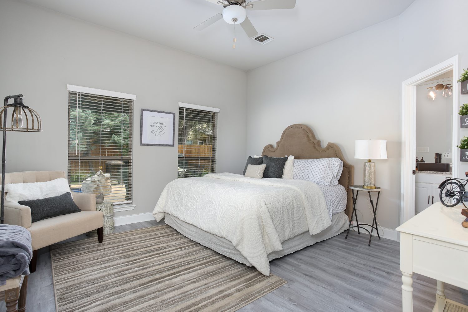 Step inside and discover the four spacious bedrooms and two luxurious bathrooms. The master bedroom is elegantly furnished, featuring a king-sized bed, a walk-in closet, two nightstands, a dresser, a cozy chair, a smart TV, and a ceiling fan. The attached ensuite bathroom offers ultimate privacy and relaxation.
