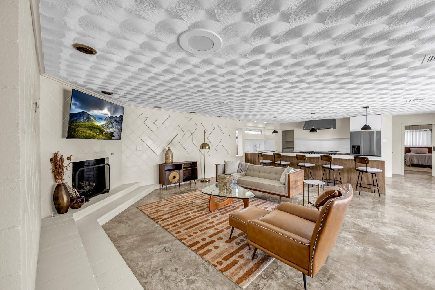 This property is a fully furnished, high-end executive residence located in the desirable Northaven corridor of Dallas. Inspired by Palm Springs modernism and reimagined with sleek contemporary finishes, this home features an iconic orange gate, a private white-walled courtyard with breeze blocks, and a striking blue sunburst entry door.